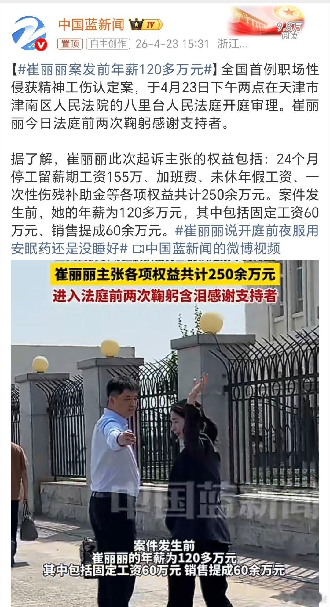 崔丽丽案发前年薪120多万元崔丽丽真的很勇敢,在遭遇侵害后,她没有选择妥协沉默,而是果断拿起法律武器,让作恶的前老板付出代价,锒铛入狱。再多的物质赔偿,都无法抚平身心留下的创伤。。。