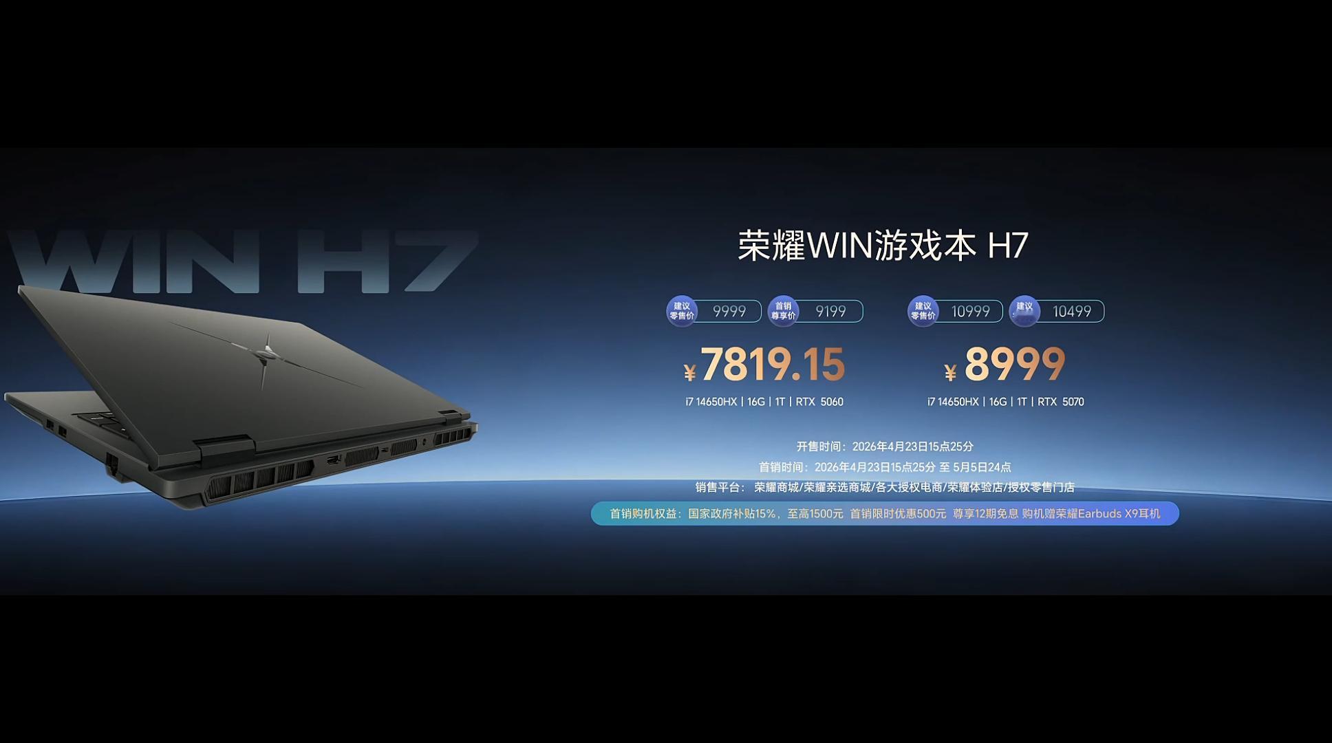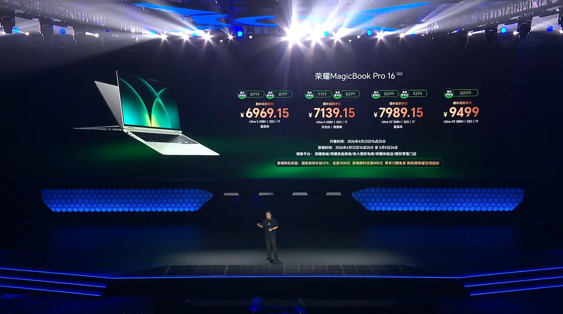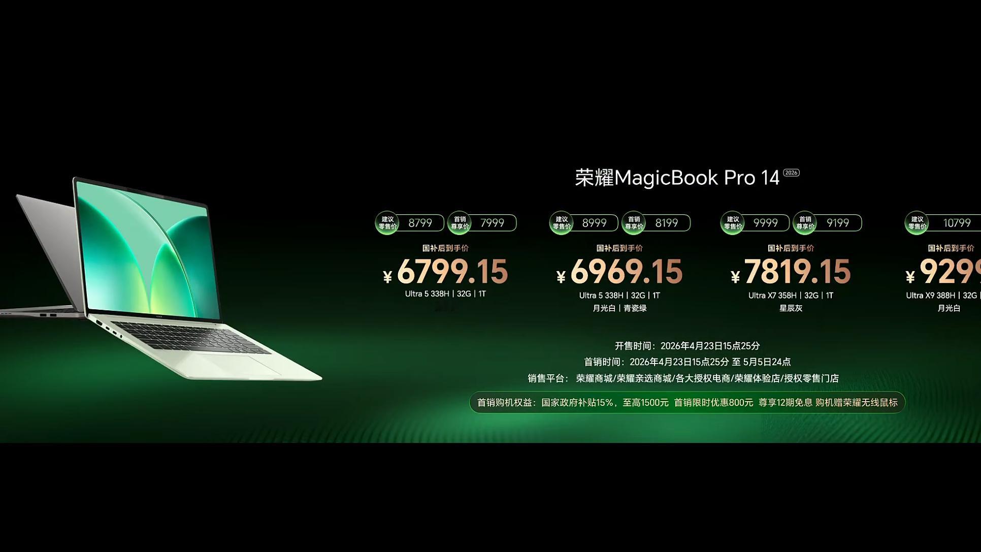 荣耀WIN游戏本H9,11999元起,国补9999元起荣耀WIN游戏本H7,9999元起,国补7819.15元起荣耀MagicBook Pro 14 2026,8799元起,国补6799.15元起荣耀MagicBook Pro 16 2026,8999元起,国补6769.15元起荣耀笔记本X Plus系列,5999元起,国补5099.15元起荣耀MagicPad 3 Pro,4499元起,国补3499元起