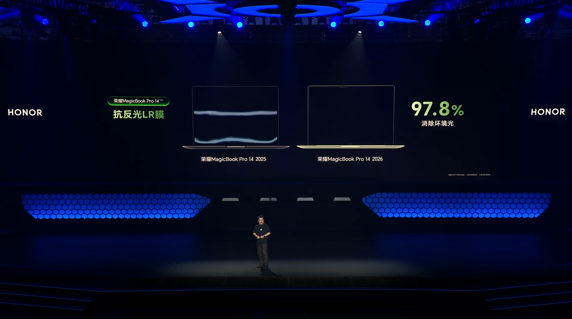荣耀MagicBook Pro 14 2026采用3.1K分辨率OLED触控屏,这次新增超低反LR膜,有效提升OLED屏幕抗反光能力;荣耀MagicBook Pro 16 2026采用3K分辨率LCD屏,支持165Hz高刷。荣耀发布会荣耀WIN游戏本
