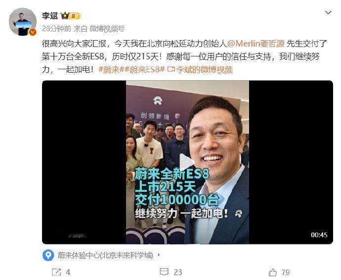 蔚来ES8交付100000台4月23日,蔚来ES8交付10万台。李斌发文称在北京向松延动力创始人姜哲源交付了第十万台全新ES8。历时仅215天,蔚来ES8交付达到100000台。李斌表示:感谢每一位用户的信任与支持,我们继续努力感谢每一位用户的信任与支持,我们继续努力!