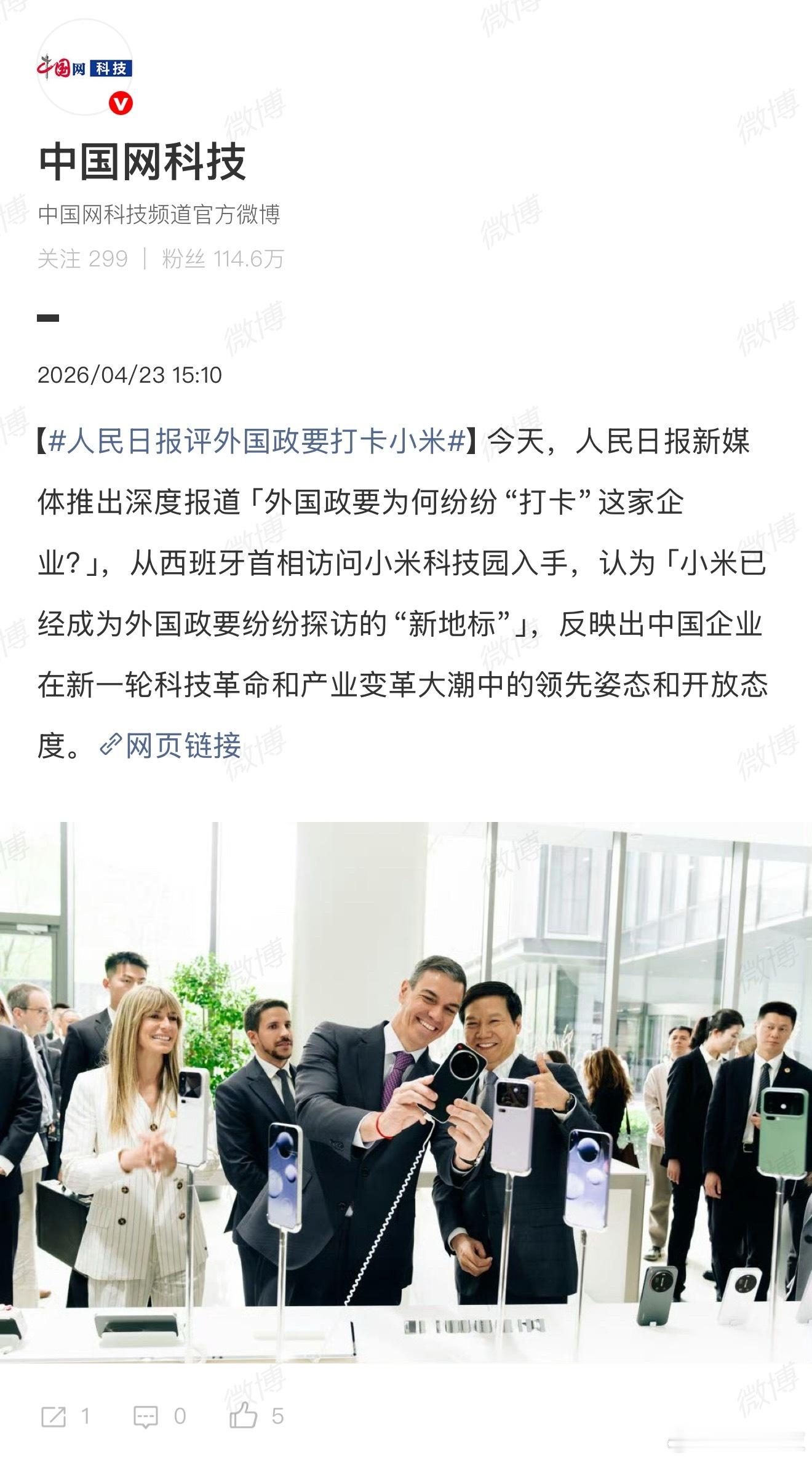 人民日报评外国政要打卡小米仔细看了一下这篇文章,我感觉说的真的很对。最近这段时间,外国政要都非常关注中国科技企业,不少人直接把参观小米作为他们的行程之一。西班牙首相桑切斯为小米YU7的车机互联点赞,阿联酋阿布扎比王储会面雷军,多国欧洲政要也曾探访小米汽车超级工厂。。。小米,已经成了中国科技制造的新名片。从一家互联网企业到高端智造,小米的成长,何尝不是中国新能源汽车产业崛起的缩影。以前你可以说中国是世界的工厂,但是现在你可以骄傲的说中国是世界智造大国。中国新能源汽车产销连续11年全球第一,拥有完整产业链与智能技术,很多外国人都不敢相信,直言“中国汽车发展到这个程度了吗?”是的,中国汽车就是发展到这个程度了。小米作为代表之一,所展现的是中国制造走向高端化、智能化、绿色化升级的样子。中国创新也不是单纯模仿,而是走向自主研发的爆发期。