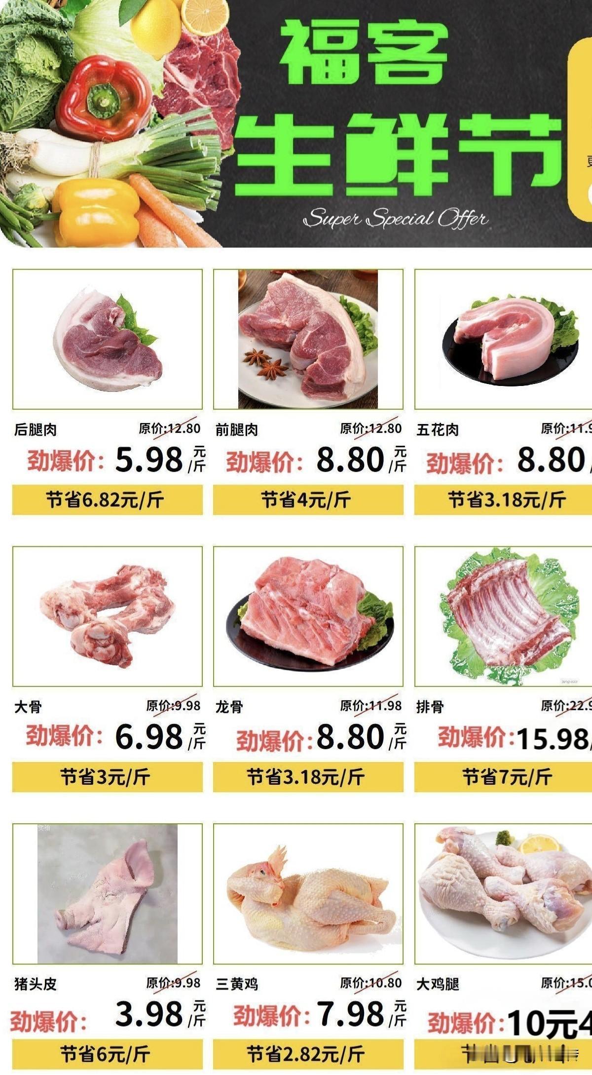 农民工晚上加班8点40。 下班后如果没有下雨,准备去超市里买几斤猪骨头来炖着吃。 说起吃猪骨头,还是那种6块9毛8的大骨头更好吃。 价钱便宜,且骨髓营养高。 说起买猪肉,建议还是趁着现在的时候,价钱会便宜点。 因为往往到了星期天,大家都放假时,市场上猪肉售卖的价格,就要往上涨个一块二块的。 你看海报上3块9毛8的猪头皮,不但带耳朵,而且还有拱嘴,目前的价格更是创了新低。 这猪头皮买回来卤一下。到时再放把辣椒一炒,妥妥的是盘下饭又下酒的硬菜!