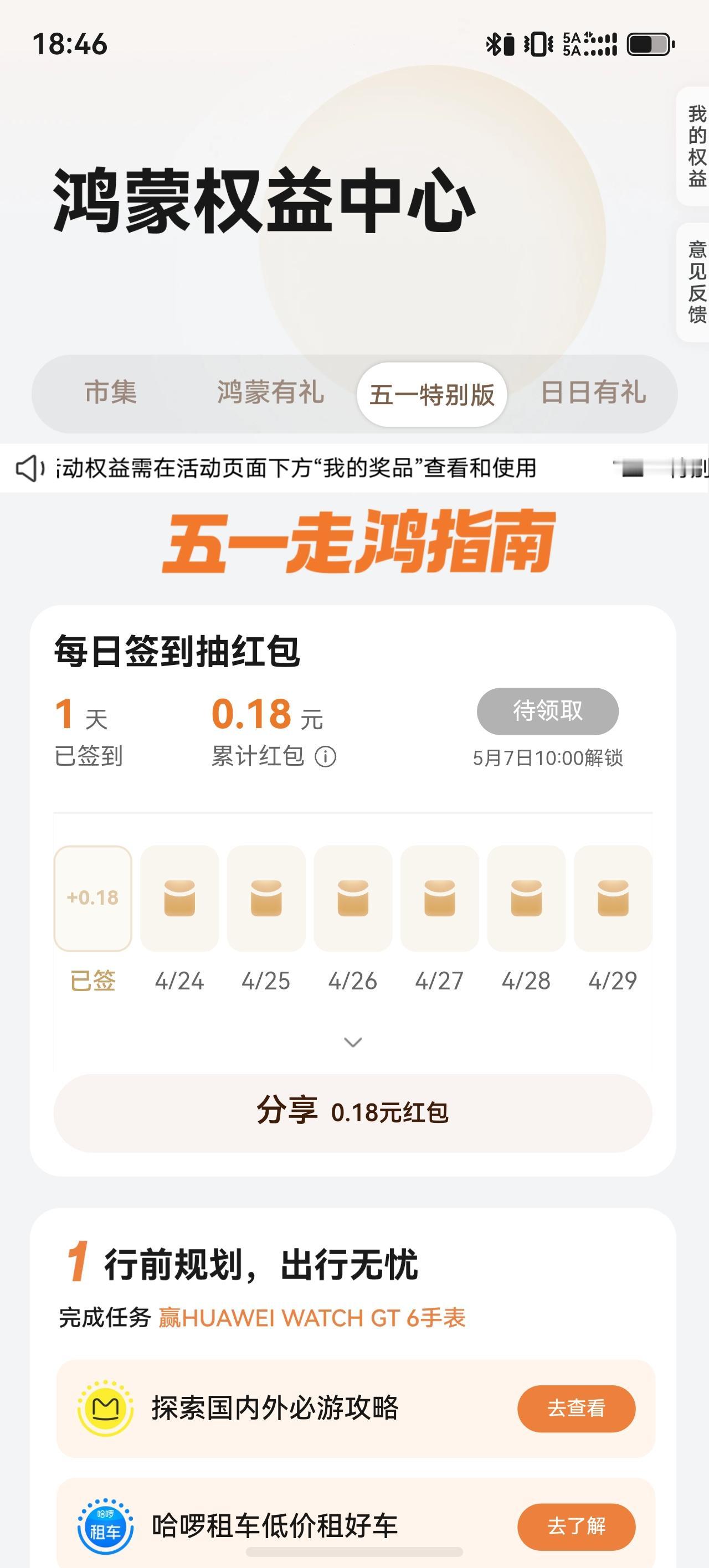 华为发红包啦!鸿蒙有礼五一特别版来袭! 华为发红包啦,还没更新鸿蒙6.1系统的小伙伴抓紧更新,更新后在屏幕负一屏找到鸿蒙有礼,点进去领取签到红包,连续签到2周,5月7日10点可以解锁提现,还没签到的小伙伴赶紧去签到,别错过这波福利!