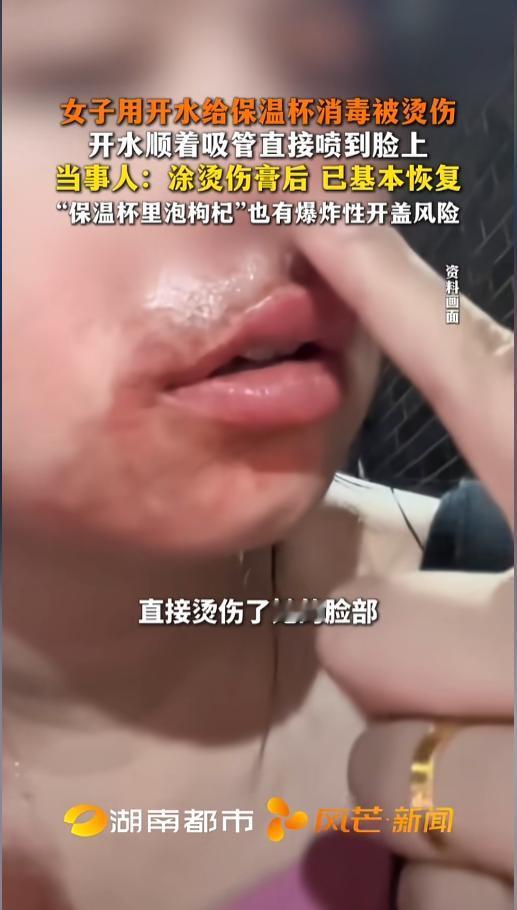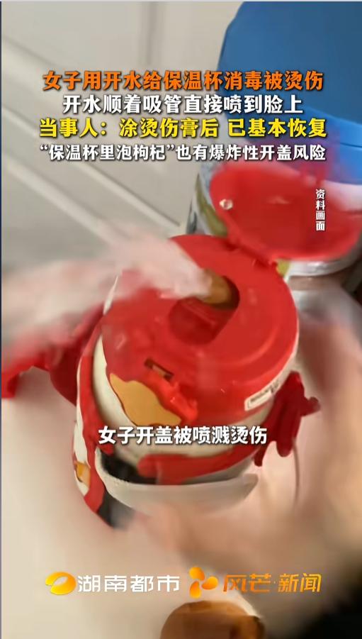 “千万不要这么干!”近日,广东东莞,一女子新买了个保温杯,自带硅胶吸管的那种。使用前,她倒上了开水进行消毒清理。打开的时候,她没注意,先把吸管口打开了,结果开水顺着吸管就喷了她一脸!网友:保温杯装热水可得多注意! 很多人用新杯子之前,都会选择用开水烫一烫,尤其是保温杯,还会拧上盖再晃一晃。不过,打开的时候可得注意,千万不能对着人。 据媒体4月23日报道,事发当天,女子正常给杯子消毒,就是打开的时候没注意,直接开了吸管的那个口,关键是,口还对着自己。女子直接被开水喷了脸,疼的她把杯子直接扔在了地上。幸运的是,抹上烫伤膏以后,她已经恢复的差不多了。 其实,吸管往外喷水是一种正常现象。当保温杯里放上热水之后,水蒸气在杯子里面膨胀,造成杯内压力升高。这时候杯盖全部打开时,就能够听到砰的一声,蒸汽冒出的声音。如果只打开吸管口,在内部压力的作用下,水就会顺着吸管喷出来。 其实不止是开水,如果杯子里泡了红枣枸杞之类的,哪怕温度降了,这些东西在里面也会发酵产生气体,一样会发生这种现象。如果杯盖不解释,放时间长了还有可能发生炸盖现象。 网友看后表示,保温杯就是一个小炸弹,这些生活常识可一定得有,否则的话,烫一下是真疼啊! 信息来源:《女子用开水给保温杯消毒被烫伤 开水顺着吸管直接喷到脸上 当事人:涂烫伤膏后 已基本恢复 “保温杯里泡枸杞”也有爆炸性开盖风险》风芒新闻