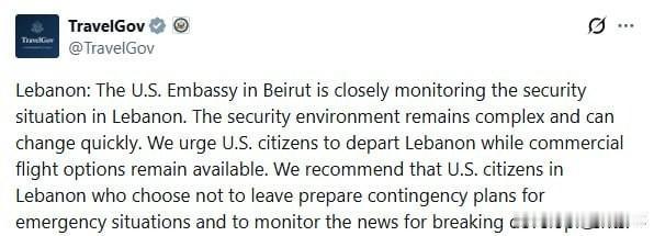 鉴于黎巴嫩安全局势持续恶化,美国驻黎巴嫩大使馆紧急敦促本国公民立即撤离该国。 美国驻贝鲁特使馆声明表示: “使馆正密切监测黎巴嫩整体局势,当地安全形势依旧严峻,且随时可能急剧恶化。我方强烈呼吁美国公民,趁目前商业民航航班仍可通行,尽快离开黎巴嫩。 对于滞留黎巴嫩、决定暂不撤离的美国公民,使馆建议其提前制定应急避险预案、持续关注新闻动态,及时掌握最新局势变化。” 美方发布高等级的侨民撤离预警,说明黎巴嫩,尤其是南部地区,以色列打击真主党的行动升级的风险急剧上升。