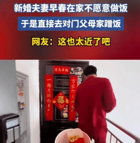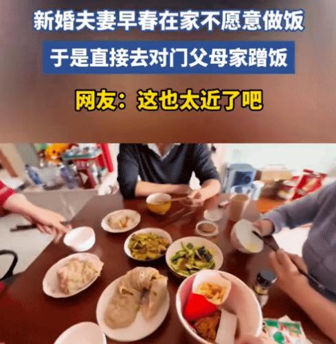 “笑不活了!”新婚夫妻在家不愿做饭。妻子问: “吃啥啊!”突然,丈夫端起碗说: “走。”没想到,丈夫直接带她去对门公婆家蹭饭。网友: 这也太近了吧! 那天傍晚,门开后,老两口看到的是儿子儿媳两张笑嘻嘻的脸,还有他们手里端着的两只空碗。 这个有些俏皮的画面,后来被妻子记录下来发到了网上,没想到竟引来了上万人的围观与会心一笑。 许多人都说,从这两只空碗里,看到了自己向往的那种家的模样。 时间倒回几个小时,小两口刚结束一天的工作,正瘫在沙发上。 窗外天色渐暗,两人肚子都饿了,可谁也没动。 冰箱里有菜,但一想到要洗、要切、要开火,那份倦怠感便压过了食欲。 这大概是许多年轻夫妻都熟悉的场景:离开了父母的羽翼,独自面对柴米油盐时,才发现“吃什么”这道日常题,有时竟如此耗神。 妻子终于忍不住,叹了口气问:“今晚到底吃啥啊?” 语气里满是懒得动弹的纠结。 丈夫没立刻回答,他盯着天花板,眼睛忽然亮了一下。 他利落地起身,走到餐桌边,拿起碗,冲妻子眨了眨眼,只说了干脆的一个字:“走。” 妻子还没完全反应过来,就被他拉着出了门,直到看见他抬手去按对门自家的门铃,才恍然大悟,忍不住笑出了声。 原来,小两口的婚房,正巧买在了父母家的对门。 这当初只是为了方便互相照应,如今却成了解决“吃饭难题”的最优方案。 门开了,屋里的饭菜香一起涌了出来。 公公婆婆,脸上没有一丝意外,只有满满的笑意,一边念叨着“来得正好”,一边很自然地接过了儿子手里的空碗,转身就去盛饭。 餐桌上,四菜一汤,热气腾腾,都是家常的味道,也都是孩子们爱吃的菜。 这看似“突袭”的蹭饭,其实早已是两家人心照不宣的默契。 公婆知道年轻人工作忙、不善厨事,总会多做些饭菜;小两口也习惯了这份宠爱,但通常会是接到电话召唤才过来。 像今天这样主动“端碗上门”,还是头一回,更像是一次带着顽皮心思的互动。 饭桌上,婆婆不停地给小两口夹菜,看着他们吃得香,脸上的皱纹都舒展开来。 公公则笑呵呵地说,以后到点就过来,添两双筷子的事儿,自家人别见外。 妻子后来在分享时特意提到,他们并非一味“啃老”。 周末他们会主动去超市为父母采买,家里的重物搬运、电器修理,丈夫都会第一时间过来搞定。 这种“一碗汤”的距离,妙就妙在既有各自独立的空间,又能随时照应。 父母能享受到子女的关心,而不被日常琐事完全捆绑;子女能获得生活的后援,却也不失成长的担当。 那两只空碗,盛的不只是饭菜,更是一种轻松、亲密、有边界感的现代亲情。 视频走红后,网友们的评论也充满了烟火气。 有人说“这简直是人生赢家配置,羡慕哭了”,也有人调侃“我缺的是饭吗?我缺的是对门的爸妈”。 更多的声音则是在讨论这种两代人的相处模式,认为这是都市生活中一种难得的智慧。 它平衡了依赖与独立,用一碗饭的温度,维系着最质朴的牵挂。 在这个外卖软件随手就能点一桌菜的时代,大家怀念和向往的,或许恰恰是这种推开对门就能感受到的、带着锅气的踏实温暖。