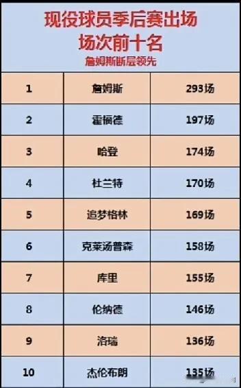 现役球员季后赛场次前十的球员。 詹姆斯断层领先,毕竟个人优秀团队优秀,职业生涯够长,现役第一。 克莱居然比库里还多三场。 最扎心的是哈登,可怜的老登是这十名球员里唯一一个没有总冠军戒指的。