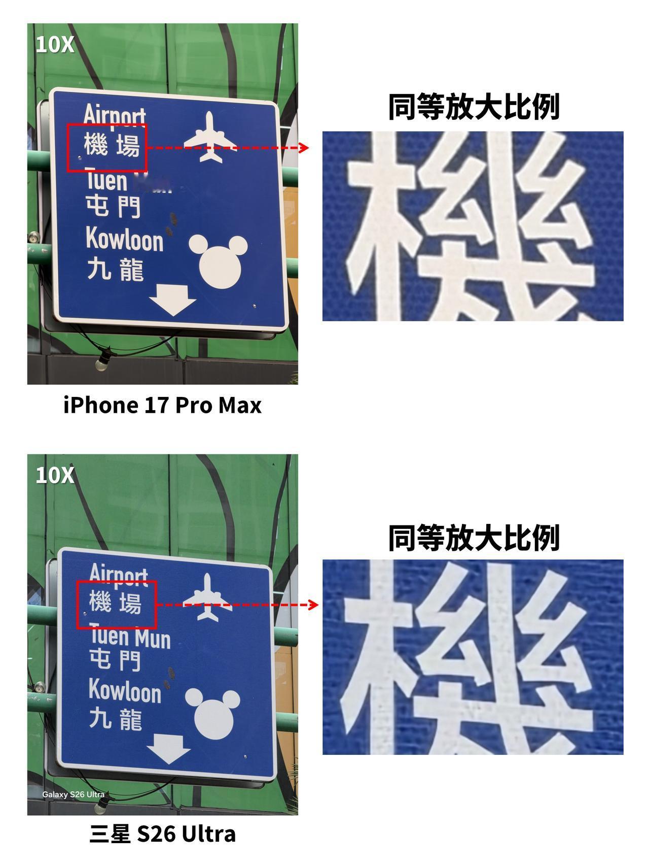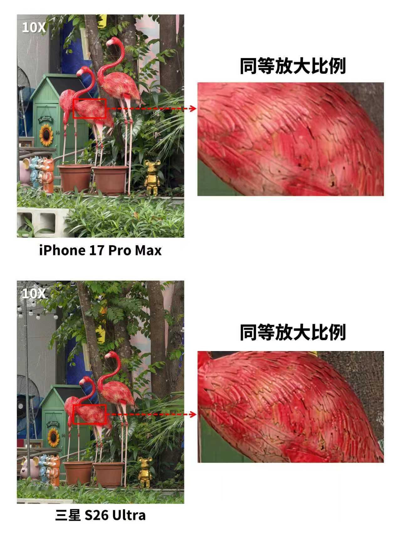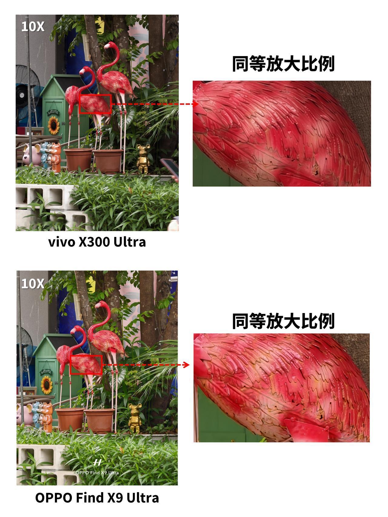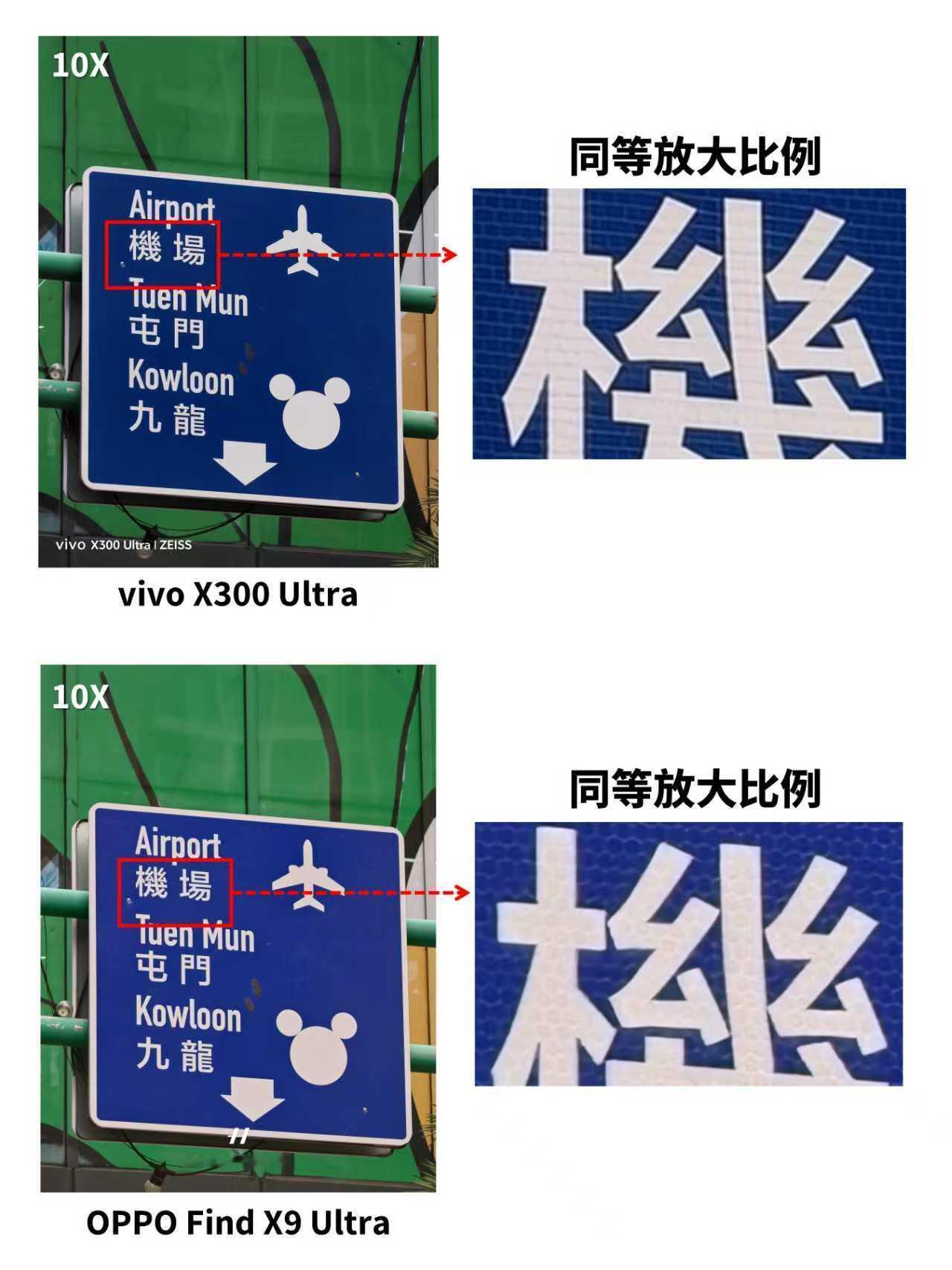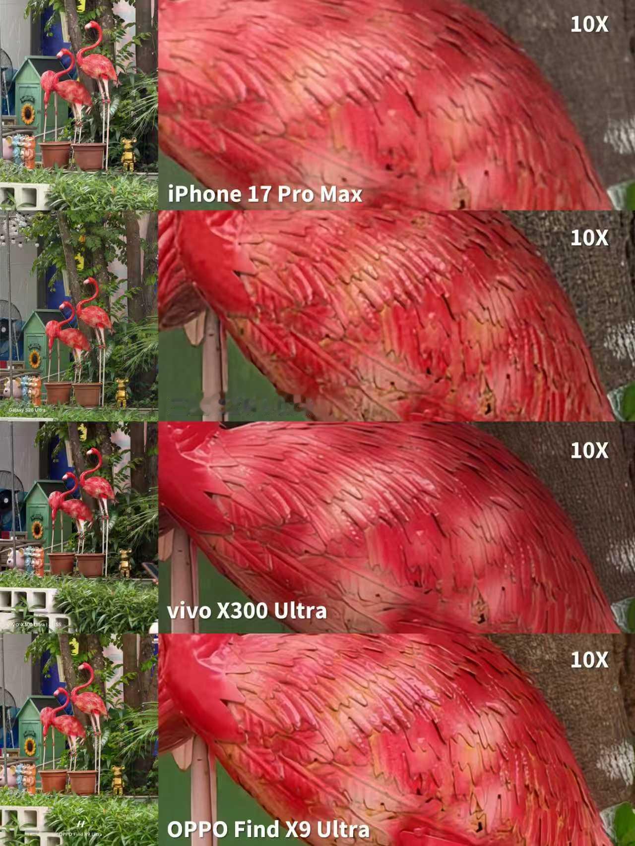 4台超大杯10倍变焦实拍,演唱会带哪台? 上半年旗舰超大杯基本都发齐啦,OPPOFindX9Ultra 价格也公布了,在网上刷到几组热门机型的10倍变焦样张。 看完只能说,纯光学和AI算法的差距,放大后一目了然。 - 直接看第☝🏻组的路牌的拍摄(图1-图3),iPhone 17 Pro Max和S26 Ultra整体效果还行,色调上有些偏浅,但放大后看细节稍微糊了,Find X9 Ultra和X300 Ultra在清晰度和色彩上的表现还是很不错的,尤其是Find X9 Ultra,自带的10倍光学变焦清晰度确实上是强,有意思的是X300 Ultra的可能是AI算法的原因,偶尔就会出现算错的情况,路牌上的纹理,苹果、三星、OPPO拍出来的都是真实的蜂窝状。 - 再看第✌🏻组的照片(图4-图6),这就体现出Find X9 Ultra内置10倍光学变焦的含金量了,靠光学素质硬挺,清晰度直接断层领先其他Ultra,早就听说这台是演唱会神器,这种10倍光变在看台拍长焦、或是外出“打🐦”的体验都没得说。 - 按这两组样张客观来讲,说Find X9 Ultra是今年zui强影像Ultra基本没跑了,这也是目前唯☝🏻不需要增距镜的Ultra,单机拍摄就差不多是别家Ultra+外置增距镜的效果!这样看,OPPOFindX9Ultra 价格貌似还更香一些?毕竟省了非要增距镜的预算。 - 那么,大家觉得这四台超大杯拍得怎么样?有没有你在用的机型?