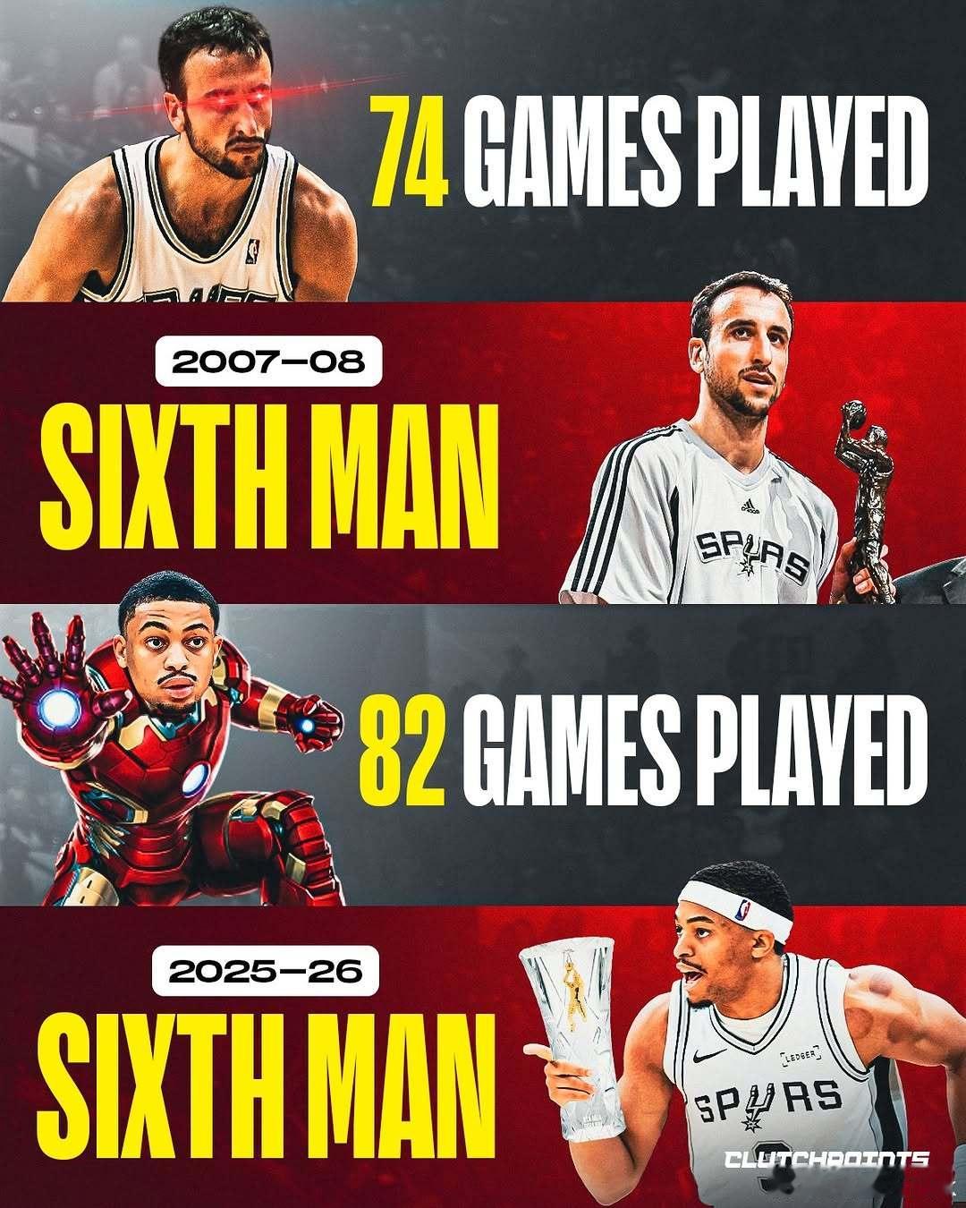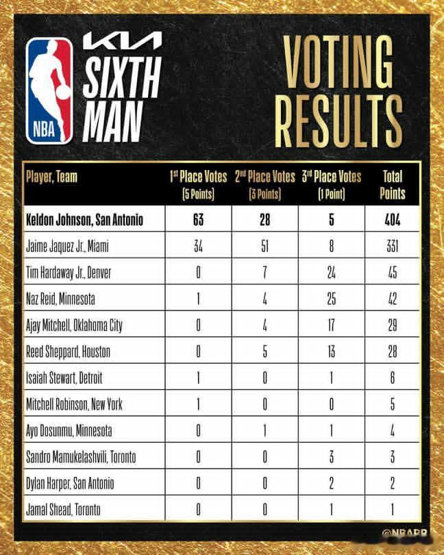 马刺2025-2026赛季NBA常规赛约翰·哈弗里切克杯(最佳第六人)获奖者凯尔登·约翰逊,马刺 队史第二位荣获该奖项的球员,此前是2007-2008赛季的马努·吉诺比利。肯塔基大学出品的第二位最佳第六人,此前是2021-2022赛季泰勒·希罗。82场全勤得到1081分刷新队史单赛季替补得分纪录,此前纪录保持者吉诺比利的927分。