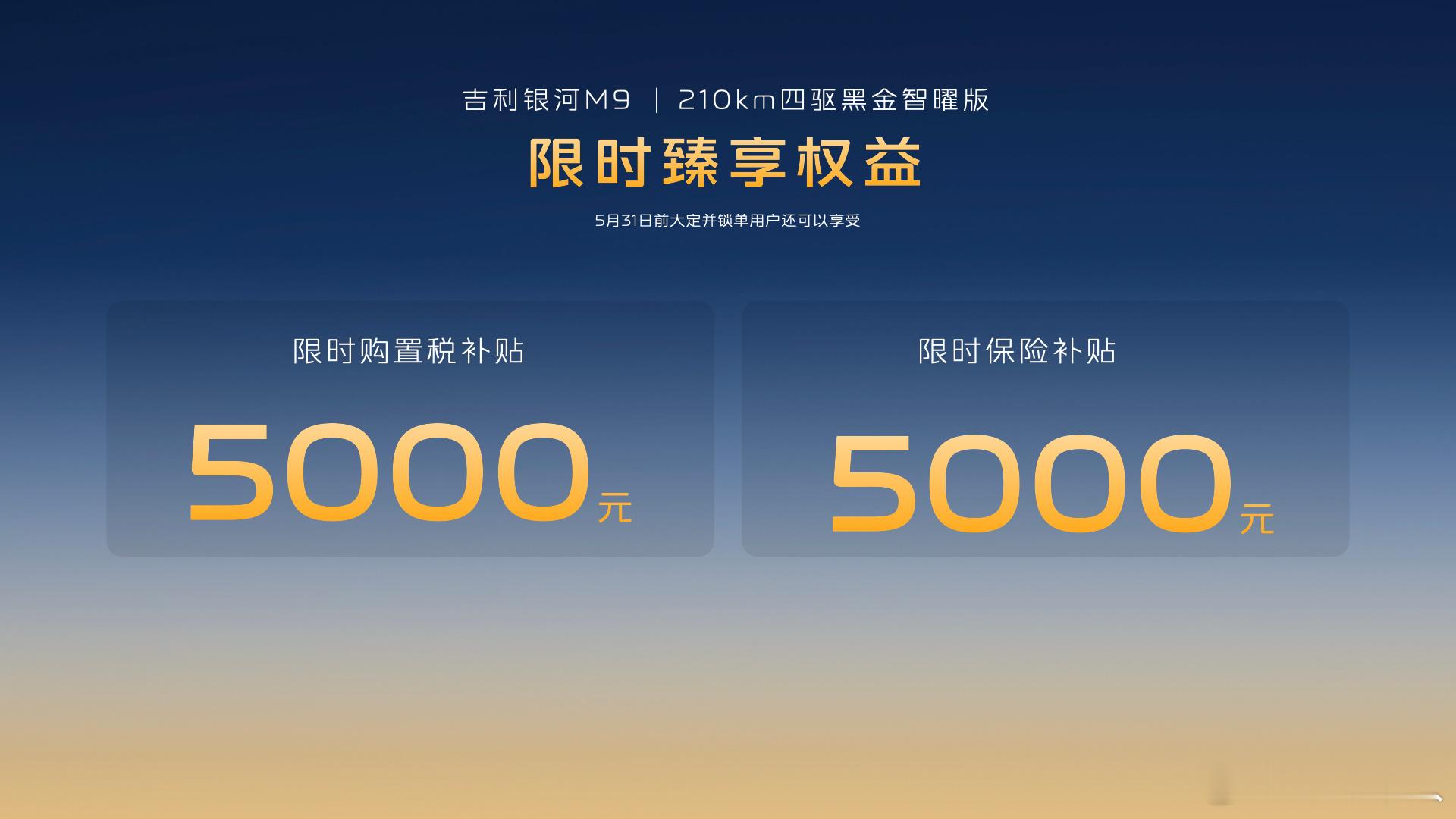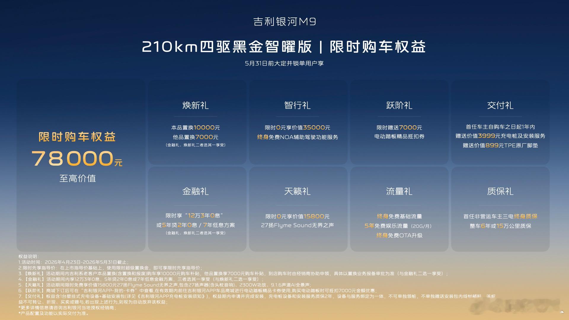 吉利银河M9高定版来了 吉利银河M9黑金智曜版正式上市,限时价25.98万元!比现款四驱顶配升级了双腔空簧,从千里浩瀚H5升级到了H7满血版,芯片也从Orin-Y升级了雷神-U,性能翻了三倍,给了专属的外观内饰配色以及21寸轮毂,路特斯给调校的空气悬架,这台车的目的就是奔着25万级大六座SUV第一来的,大家觉得这个价格和竞争力你觉得怎么样?