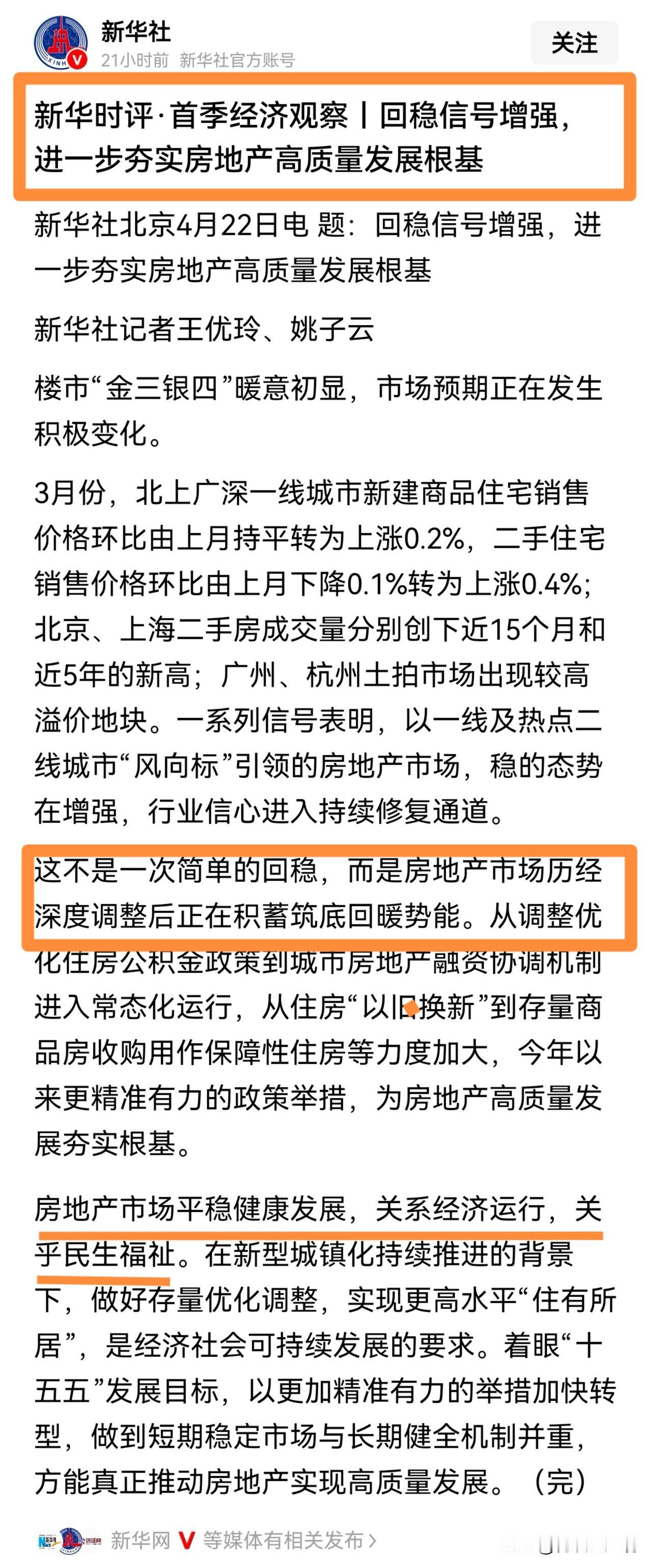 房价保卫战,打响了! 国家在护盘,空头在唱衰。你觉得谁会赢? 4月18日,人民日报发文《房地产市场,稳的态势在增强》。 4月22日,新华社发文《回稳信号增强,进一步夯实房地产高质量发展根基》。 4月22日,杭州公布了恶意唱衰房地产的举报电话。 2021年,深圳打掉深房理,因为他炒房,抓进去了; 2026年,唱衰者,也会被封杀处理,因为他破坏稳定。 识时务者为俊杰,智者懂得顺势而为,小白一辈子都是小白。