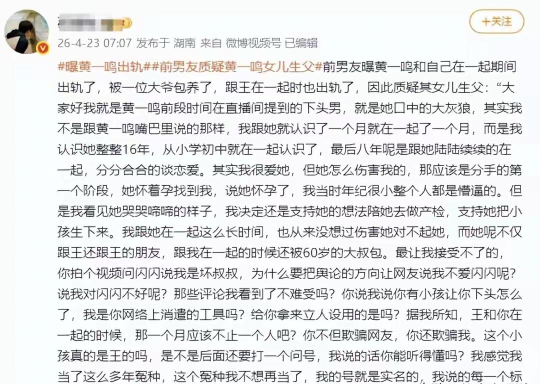 炸锅!黄一鸣被曝婚内出轨,孩子生父疑云再起,还曾交往60岁大叔! 娱乐圈又爆大瓜,这次直接砸向黄一鸣! 有知情人重磅爆料,黄一鸣私生活混乱不堪,不仅被指婚内出轨,孩子生父身份再度遭到质疑,引发网友热议。 更让人震惊的是,爆料称她在感情空窗期,还曾与一位60岁大叔交往,种种消息颠覆大众认知。 此前黄一鸣一直因孩子与王思聪绑定,频繁引发话题,如今猛料接连爆出,时间线彻底混乱,孩子生父到底是谁,瞬间成谜。 不少网友表示:这瓜越吃越乱,完全看不懂了! 黄一鸣 王思聪 黄一鸣孩子生父 娱乐圈大瓜