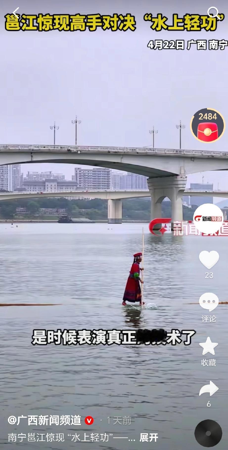 4月22号在南宁邕江上演的“独竹漂”太绝了!这是贵州和广西两地共有的非遗技艺,艺人脚踩单竹、手持竹竿平衡,在水面上如履平地,既藏着“水上轻功”的灵动,又透着传统技艺的厚重。(来源于@广西新闻频道 )
