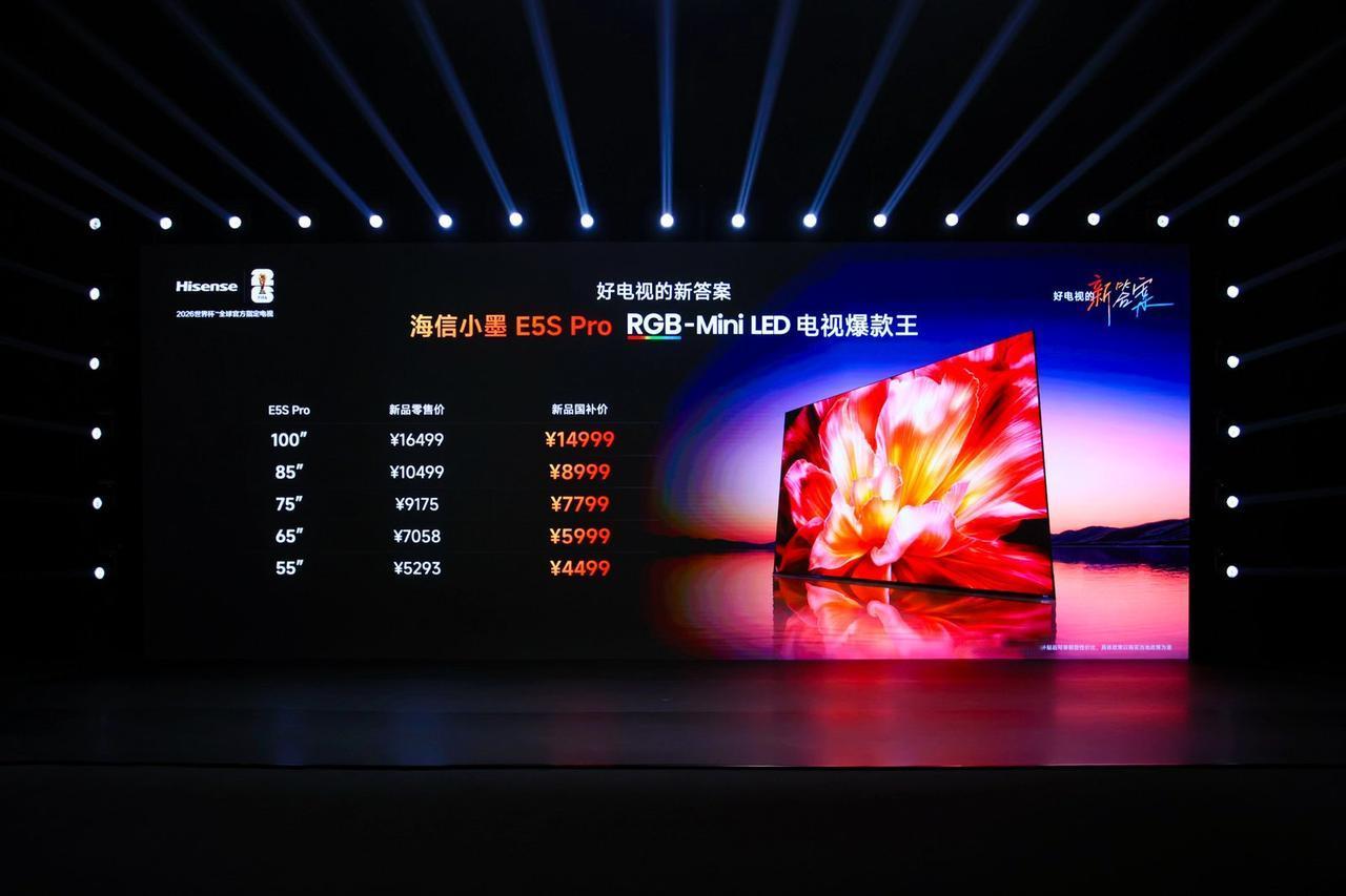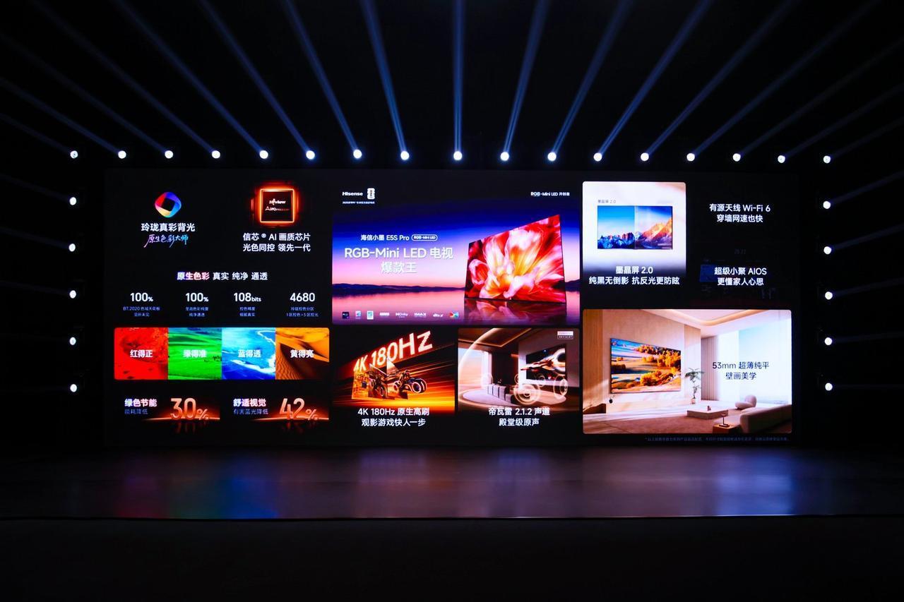 海信正式发布小墨E5S Pro,超薄贴墙设计让客厅颜值翻倍 电视越做越厚,挂墙像背了个书包?海信正式发布小墨E5S Pro用53mm旗舰级超薄一体机身+8mm极限贴墙,挂墙宛如壁画。 这还没完。墨晶屏2.0整机超低反射率仅2.6%,专业AG防眩层,屏幕物理透过率提升20%,画面更通透、鲜活。息屏时像一面高级黑镜,亮屏时色彩纯净无杂光。 画质同样顶级。RGB-Mini LED技术实现红、绿、蓝三原色纯净直出,不再需要量子点二次转换。玲珑真彩背光专为RGB-Mini LED定制,杜绝杂散光,达成100% BT.2020顶级色域、100%色纯度与89%色彩体积。 至高4680玲珑控色分区,XDR Pro 3000nits亮度,创新的RGB定向旋转阵列实现“1区控色>3区控光”。信芯光色同控AI画质芯片以108bits精度智能实现三维光色同控,AI超清晰解构Pro可将低清片源重构为接近4K画质。 从发光源头降低42%有害蓝光,整机功耗直降30%。帝瓦雷2.1.2声道165W峰值功率,25W独立低音炮,60Hz低音下潜。原生4K 180Hz高刷,Wi-Fi 6信号稳定性提升178%。 首发75英寸补贴后7799元,85英寸8999元。想提升客厅颜值又不想牺牲画质?小墨E5S Pro是最优解。