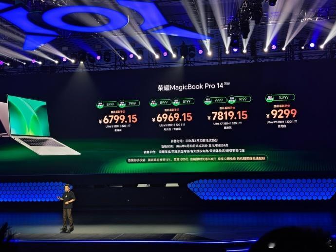 荣耀今日发布三款新品:荣耀WIN游戏本,最高RTX 5070Ti,2+4轴流风扇270W散热,38分贝下170W静音模式,16英寸300Hz雾面屏,双DDR5+双SSD槽位,H9国补9999元、H7(RTX 5070+i7 14650HX)7819元;MagicBook Pro 2026续航超M5 MacBook Pro 14,92Wh电池+Turbo X调度,顶配Ultra X9 388H,14寸3.1K OLED触控、16寸3K 165Hz屏,国补分别6799.15元、6969.15元;MagicPad3 Pro 12.3重450g厚4.8mm,3K 165Hz OLED屏,骁龙8 Gen5+双系统,售价3499元。