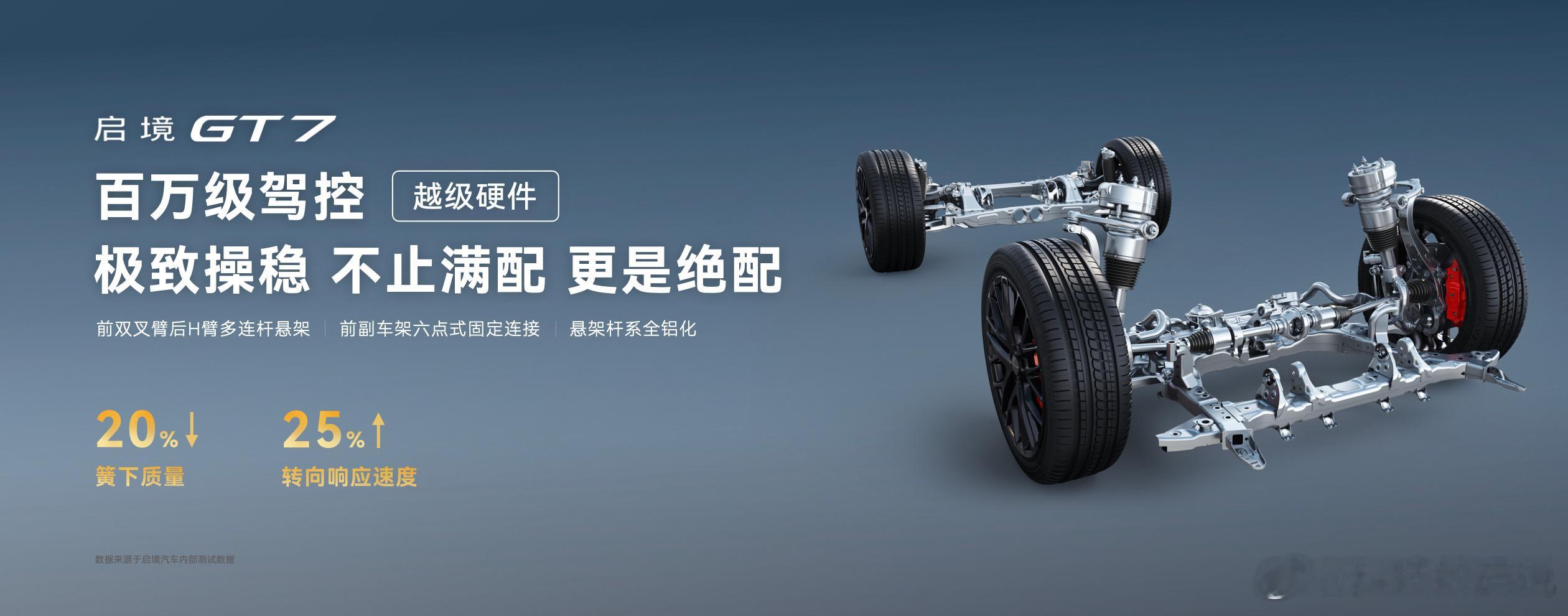 启境GT7百万驾控三大底牌揭秘 启境GT7的这个底盘确实有东西呀!配备前双叉臂后H臂多连杆悬架,结合前副车架六点式固定连接,转向响应效率提升至65毫秒,弯道中依然有灵活身手。同时搭载闭式双腔空气悬架,抗俯仰与抗侧倾性能提升20%,刚度调节幅度提升36%,配合德国大陆高性能四活塞固定卡钳+倍耐力P ZERO轮胎,百公里制动距离33米以内。另外,启境全球品牌代言人黄景瑜专属定制新色——帕米尔黑正式发布,至此,启境GT7全系七大配色集结完毕,关键含华量拉满,首发华为乾崑智驾ADS 5、鸿蒙座舱小艺智能体等黑科技,北京车展期间大家就可以近距离感受了!