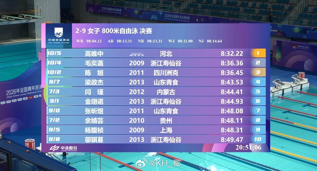 全国青年游泳锦标赛 女800自快组决赛高唯中 8:32.22 毛奕菡 8:36.36陈姮 8:36.45