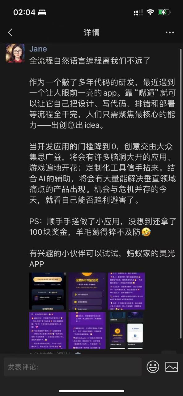 别让创意烂在脑子里!灵光首批创作奖励真的到账了 今天必须来跟大家分享个新鲜事——灵光分一亿的创作激励计划,首批获奖奖励已经正式发出,钱都实打实到创作者手里啦,还是今天刚官宣的消息,太让人惊喜了! 一直觉得,我们每个人心里都藏着不少奇奇怪怪又可可爱爱的想法,可大多时候都觉得“只是想想而已”,根本没法变成现实。但灵光真的彻底打破了这个难题,全程不用懂代码,不用学复杂的设计和开发,哪怕是零基础的普通人,只要把心里的想法说出来,就能做出专属的闪应用。 不管是想做个日常打卡小工具、趣味互动小游戏,还是专属的生活攻略、学习辅助应用,短短几十秒就能生成,发布到灵光圈里,就能参与评选拿奖励。这次首批获奖的,全都是普通创作者,没有专业背景,全凭着自己的创意和热爱,把脑洞变成了能用的小应用,还顺便拿到了奖励。 其实比起奖金,更让人开心的是创意被认可、想法能落地的成就感,那种“原来我的想法真的能变成实实在在的东西”的快乐,是别的事情给不了的。 而且现在参与的人还不算多,获奖和拿激励的机会特别可观,每天都有对应名额,门槛低、机会大。如果你心里也有没说出口的创意,千万别再让它烂在脑子里,来灵光试试,把想法变成应用,既能实现创作欲,还能收获意外奖励,真的太值了!
