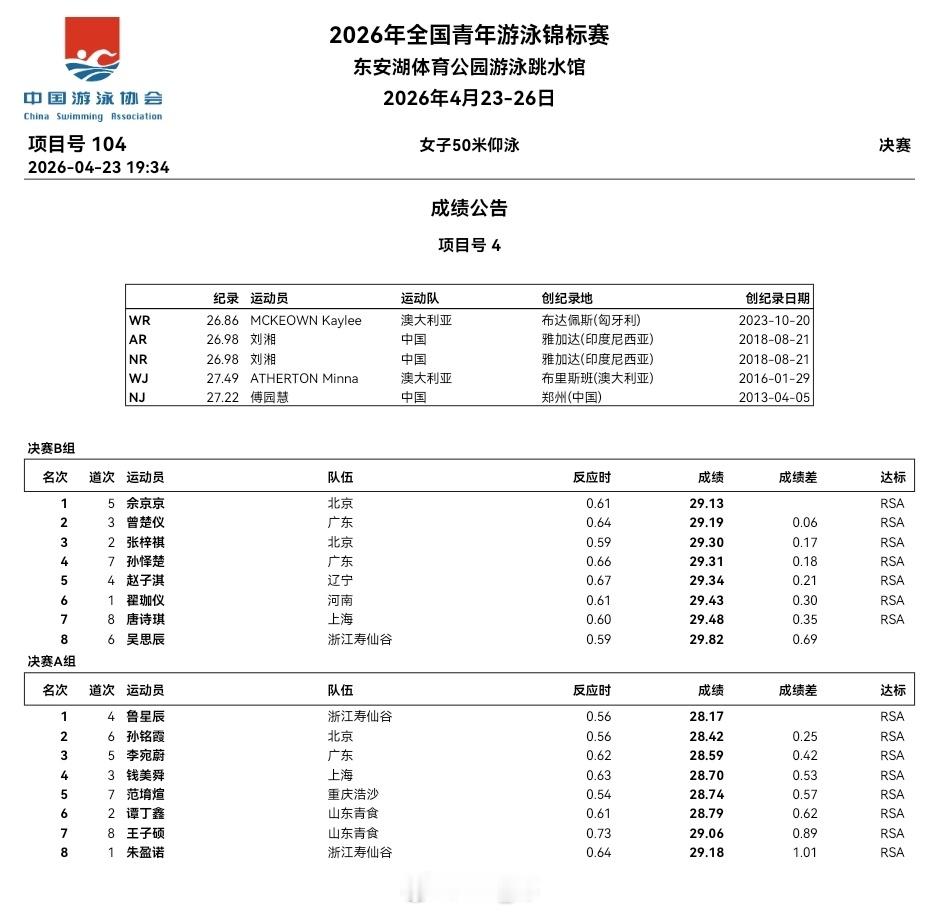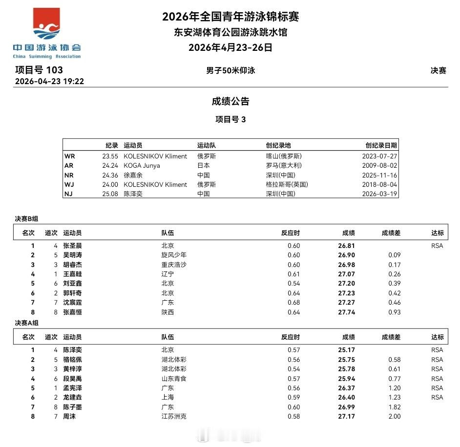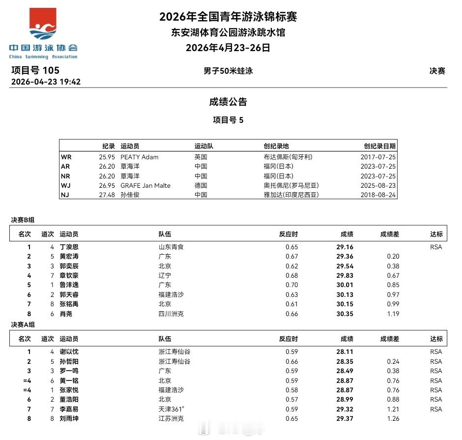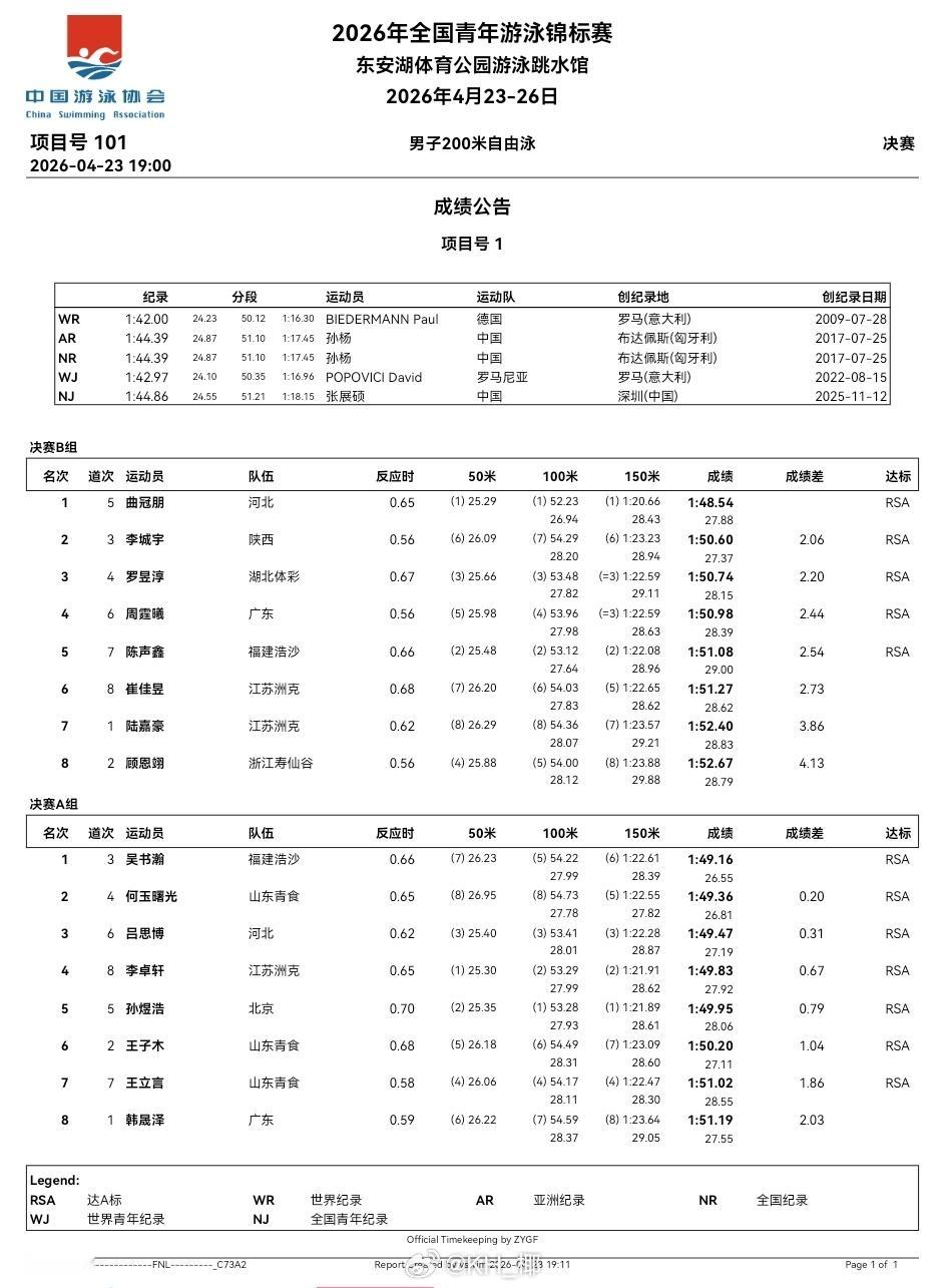 全国青年游泳锦标赛 第一天决赛成绩公告(缺女800自)