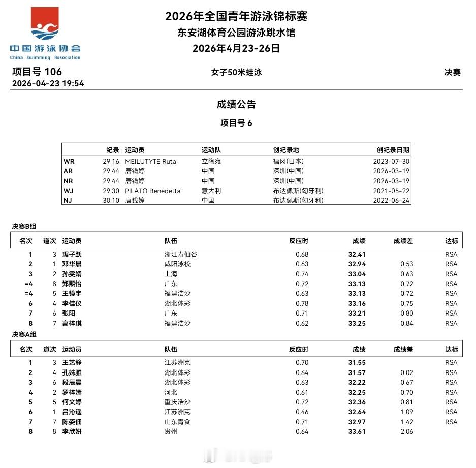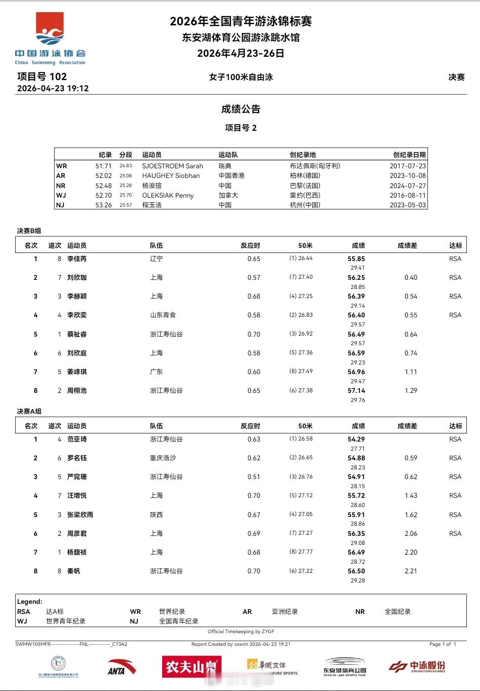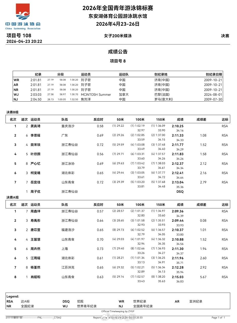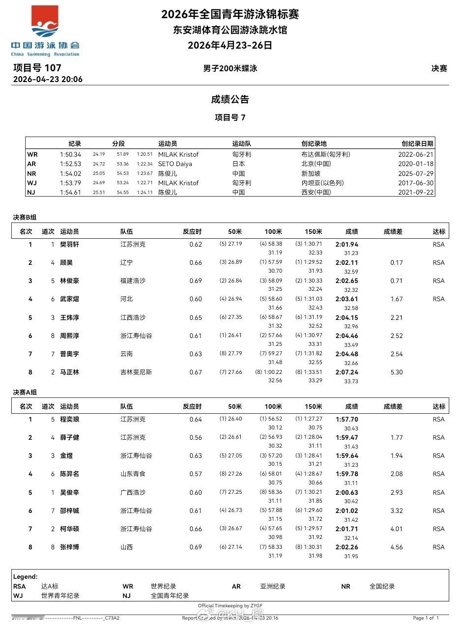 全国青年游泳锦标赛 第一天决赛成绩公告(缺女800自)