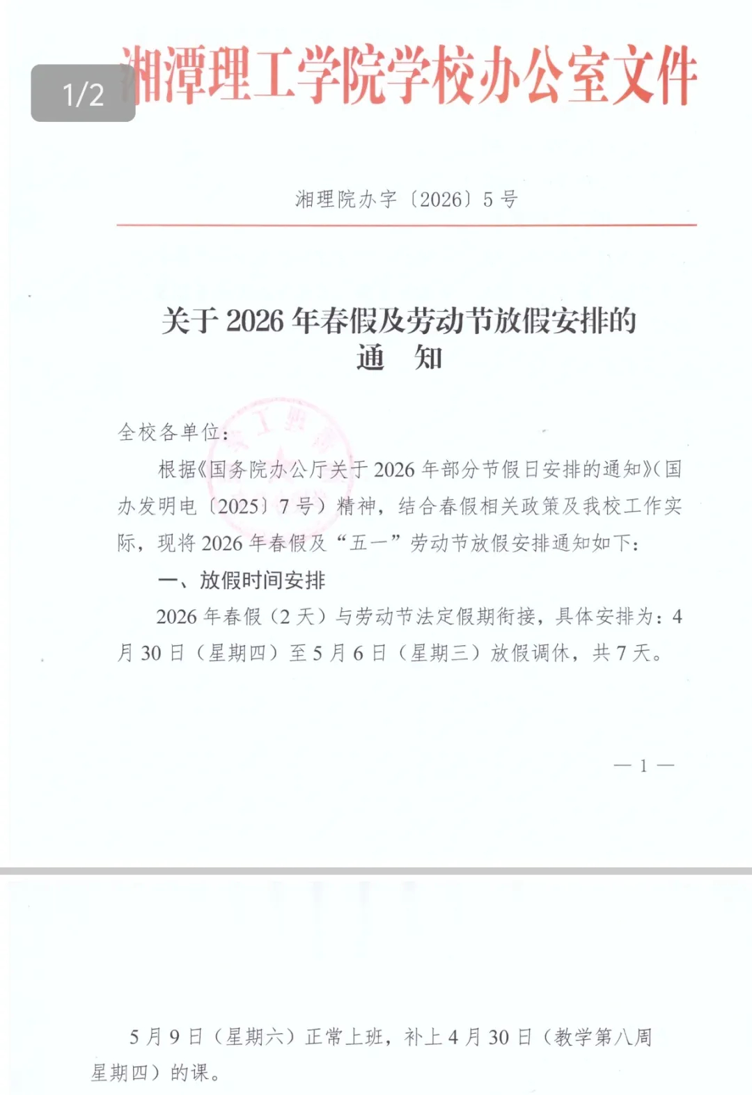【#多所高校官宣春假# 有你的大学吗?】继多地中小学设立春假后,近日,又有#多所高校迎来春假#。4月17日,湘潭理工学院发布《关于2026年春假及劳动节放假安排的通知》,表示学校将于4月30日至5月6日放春假,与劳动节法定假期衔接,连休7天。据悉,这是湘潭理工学院首次给学生放春假,也是湖南首个官宣放春假的高校。此外,还有多所高校已官宣启动春假。网页链接
