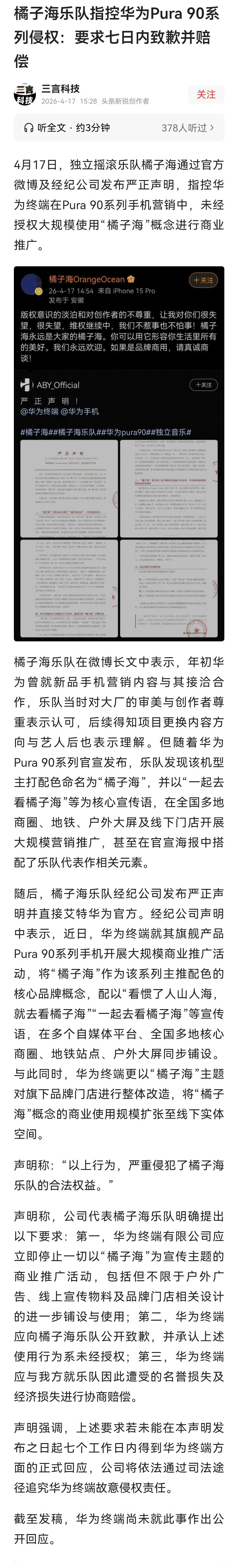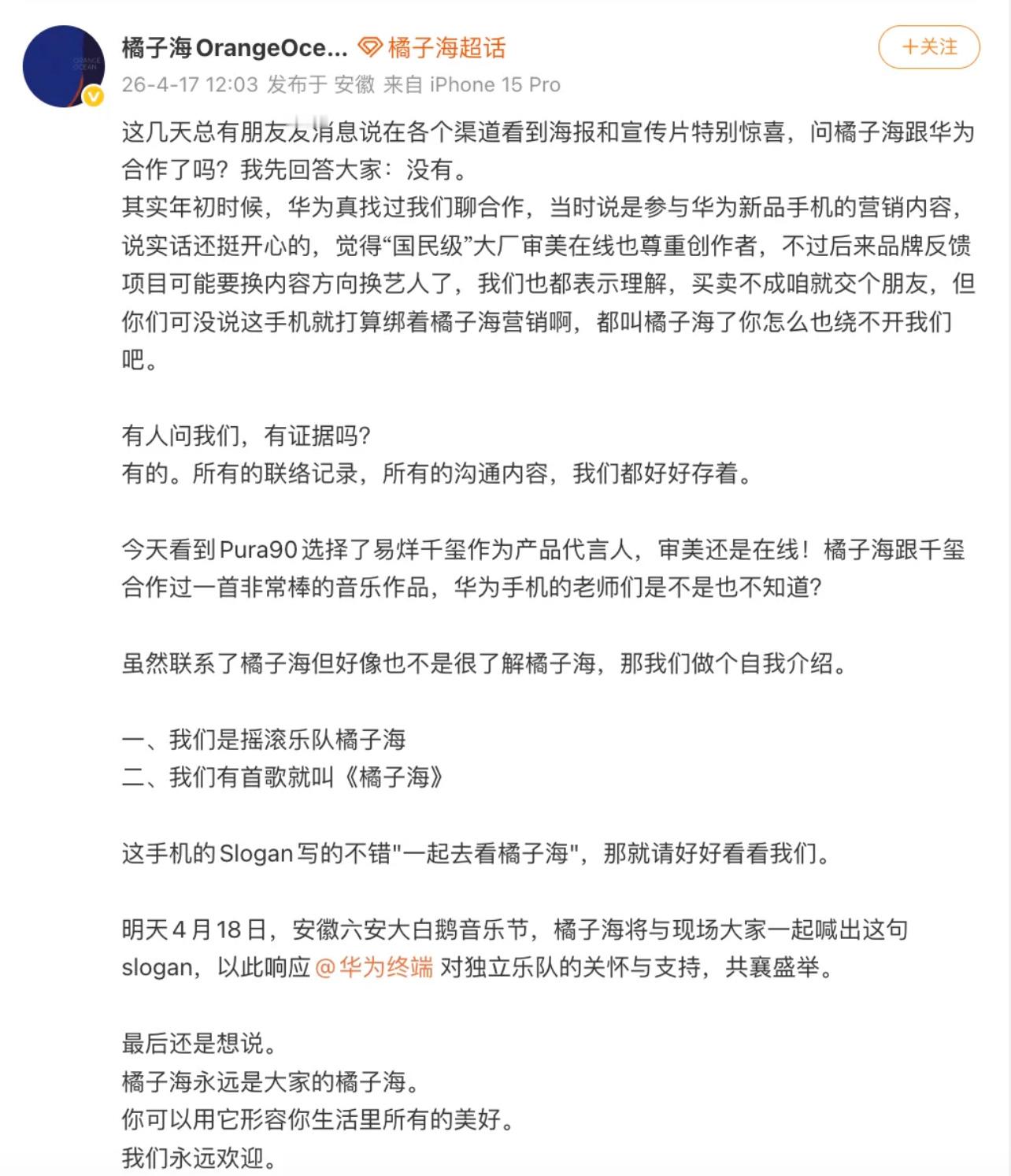 橘子海乐队近日发布声明,称华为未经授权使用其专属名称并构成侵权,要求对方公开致歉且赔偿相应损失。针对这一舆论争议,余承东在发布会现场并未直接回应侵权相关问题,仅表示“橘子海颜色来自于自然景观”,以一句轻描淡写的表态,间接回应了此次风波。