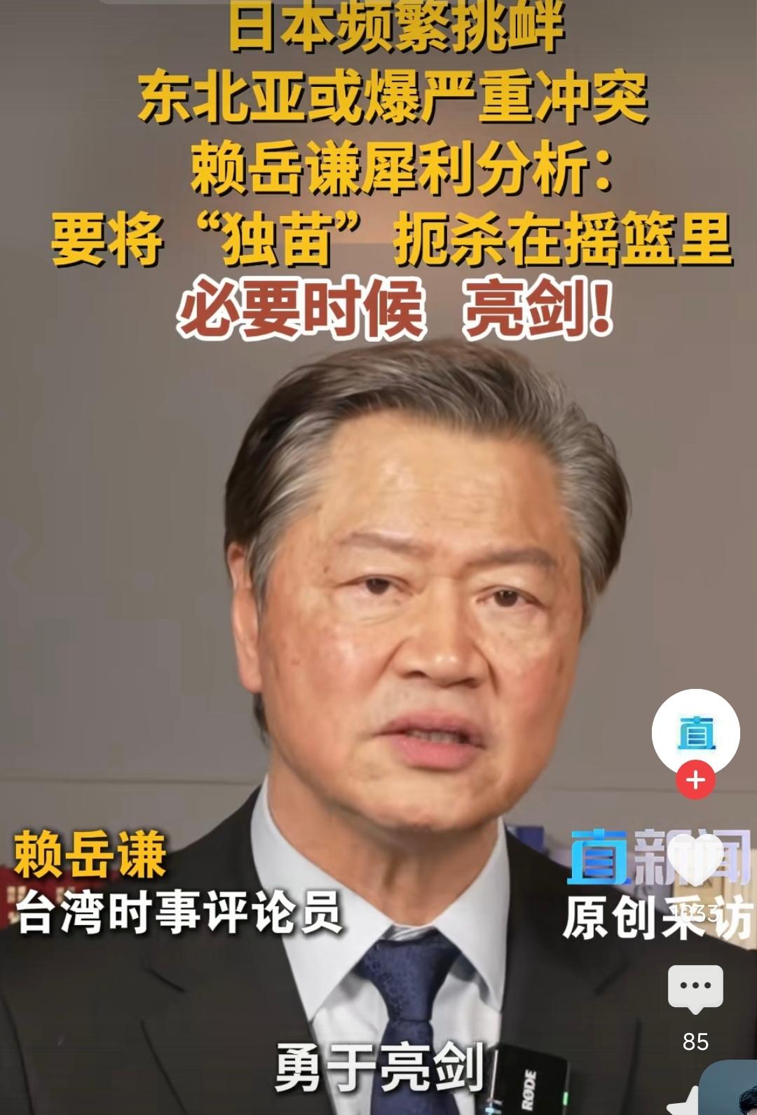 针对当下日本在台海、东北亚不断挑衅,台湾时事评论员赖岳谦直言不讳地表示:“东北亚局势可能会爆发严重冲突,所以大陆必须要做好准备。如果你姑息就会养奸,一旦放任就会后患无穷,让自己未来蒙受更大的损失”。 在谈及应对之策时他强调:必须要在这棵“独苗”还没发展起来之前将其拔掉,这是当下该做的事。既然要拔掉,就要敢于行动,必要时要勇于亮剑! 在我看来,赖岳谦这番话,既戳破了日本借台海问题搅局、妄图突破军事限制、重拾军国主义野心的真实面目,也道出了全体国人在面对外部挑衅时的共同心声,可谓是一针见血。 "亮剑"不是好战,是止戈。历史已经反复证明,对侵略者的妥协、让步,只会换来变本加厉的欺凌。绥靖止不住战火,只会养虎为患、养奸成害。今天若不敢亮剑,明天必受其乱。 "亮剑"不是鼓吹战争,而是以战止战、以强止乱。我们亮出来的是主权底线、是反制决心、是历史正义。今天的中国,有足够的底气和能力、捍卫自己的利益。 国虽大,好战必亡;天下虽安,忘战必危。眼下,日本的挑衅已到“临界点”,妥协换不来和平。赖岳谦教授不是在危言耸听,而是清醒的预判:对日本不能心存幻想,对一味的挑衅不能有丝毫姑息。 该亮剑时亮剑,这不是冲动,而是底线,也是守护家国安宁的唯一正道!