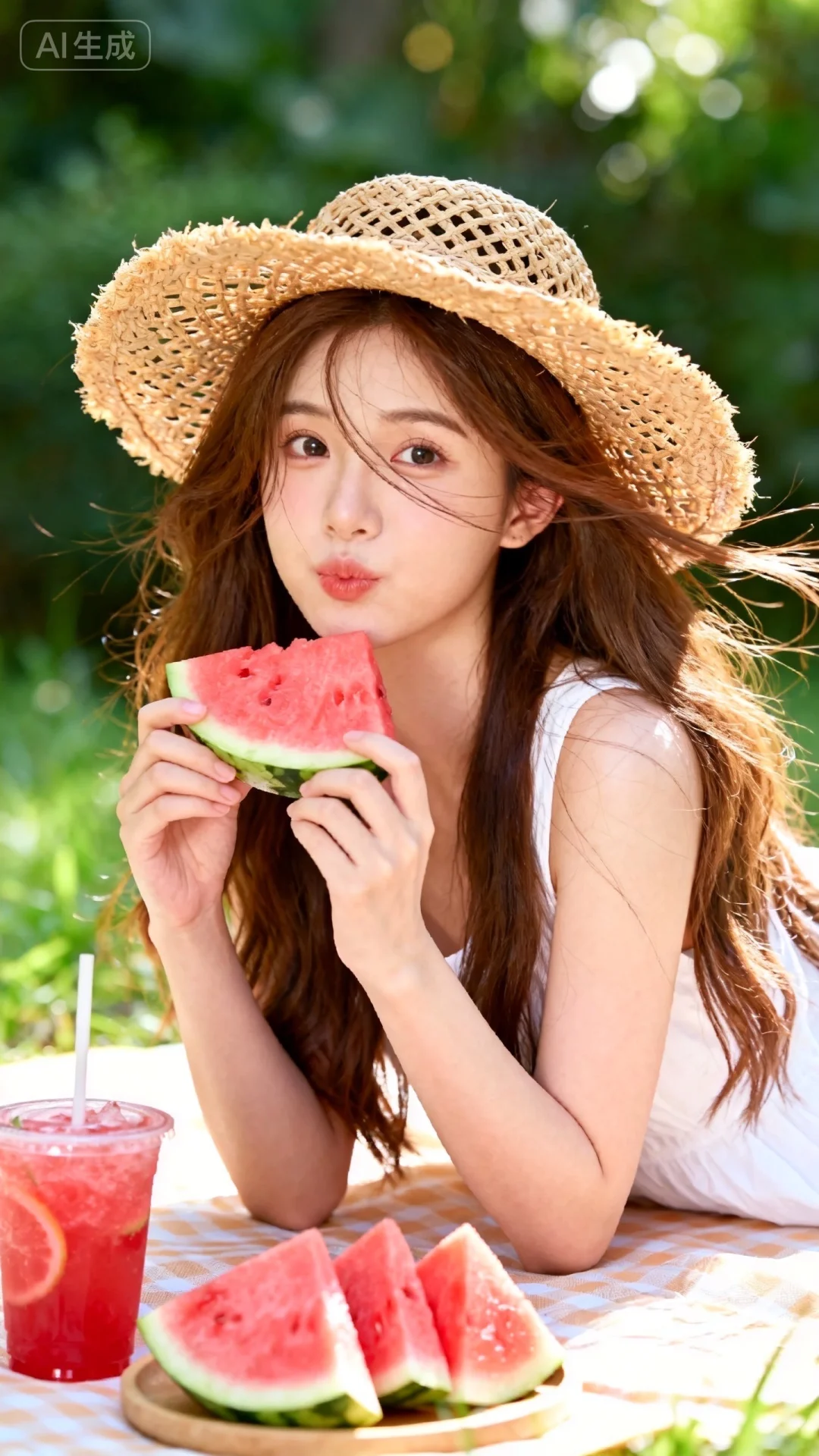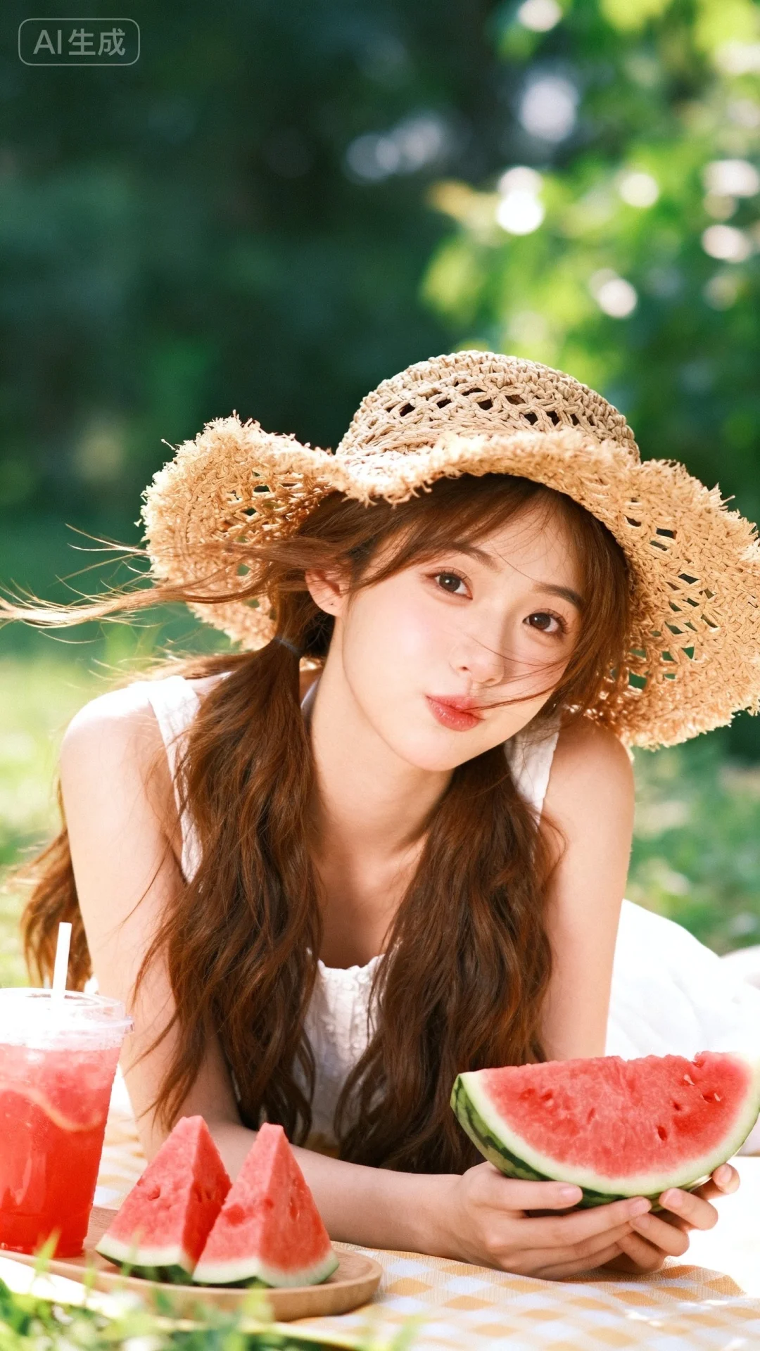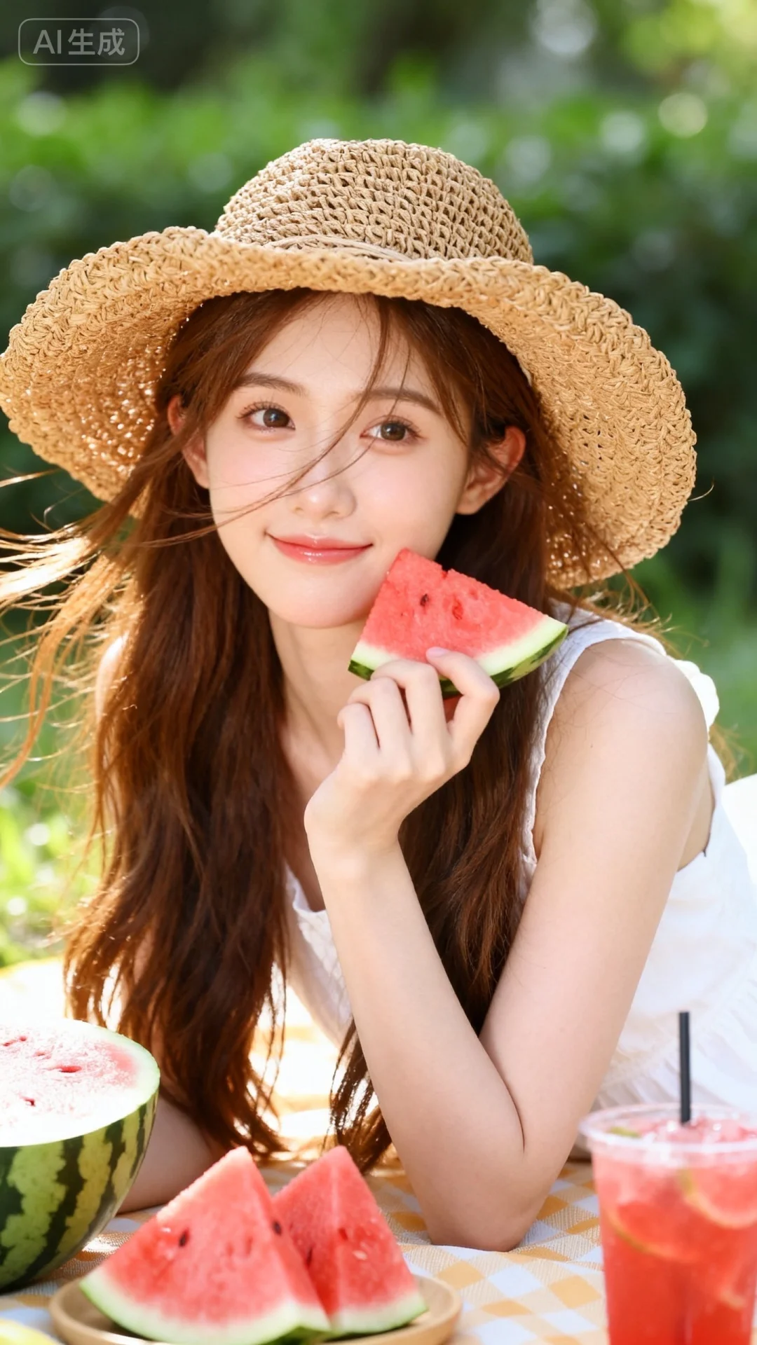 夏日西瓜野餐,东亚美少女,甜美可爱,棕色长发,身着白色无袖裙,戴粗编草编帽,手捧一块西瓜,趴在摆着西瓜块、西瓜冰饮的桌前,户外绿植场景,暖调斑驳日光,清甜慵懒的夏日野餐质感。风格甜美少女系,氛围慵懒俏皮,东方美女,发丝呈现出自然的蓬松感与垂坠感,长发散落于肩头两侧,几缕发丝拂面,皮肤白皙,偶像气质,fairskin,气质的江南美女子,近景写真,有点甜美,风吹感,随机动作,随机表情,皮肤美白透亮,表情可爱,甜美氛围,独特韵味的美,可爱表情