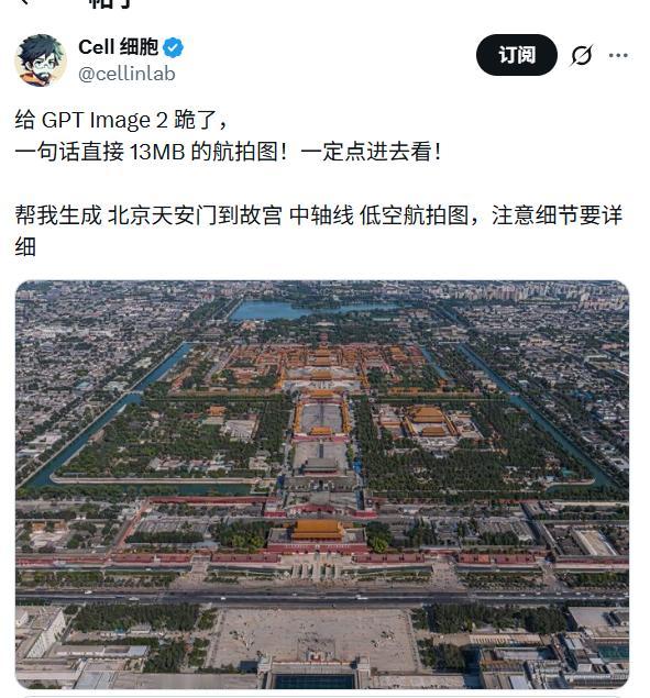 GPT Image 2太恐怖了! 今天看了非常多GPT Image 2的生成照。 绝大多数生成照,足以以假乱真。 感觉技术再发展下去,会愈发真假难辨! 只有“中轴线”这张,是一眼假。 我曾经非常认真地用google地图,研究过紫禁城和中轴线。 所以非常清楚,北京的中轴线不是正北,北偏西有2度多。 这张生成图太正了。可前提是,你得知道呀! Source: X