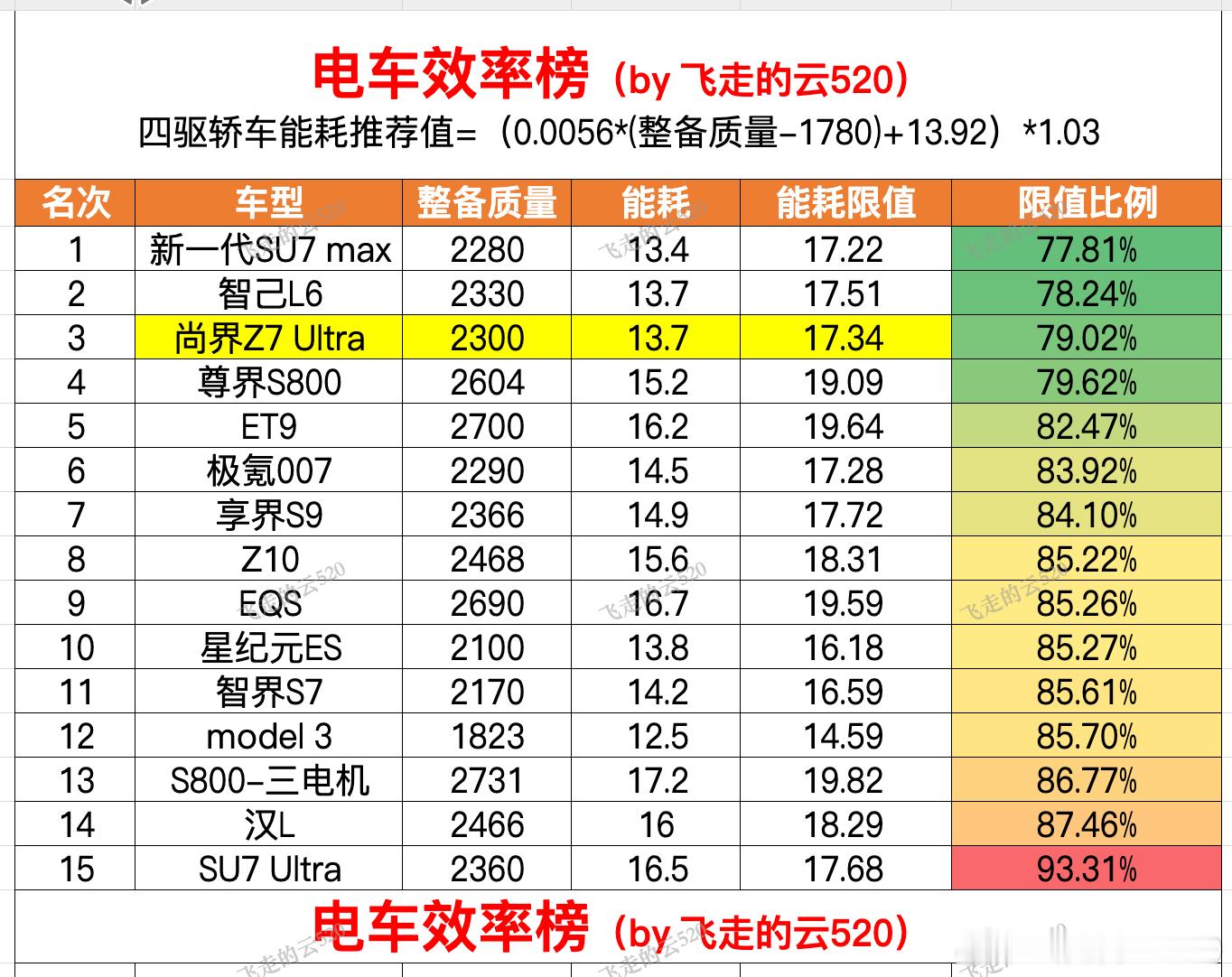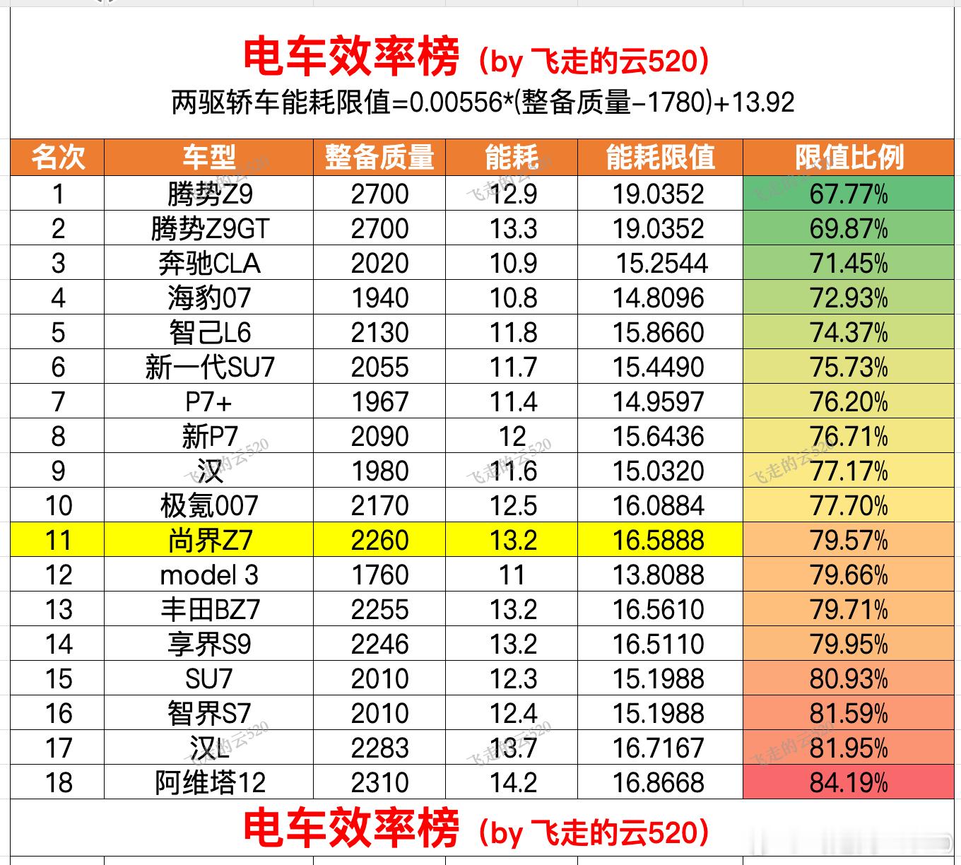 当然还是要把尚界Z7的数据放到GB 36980.1-2025的公式里面,计算电车效率榜 排名