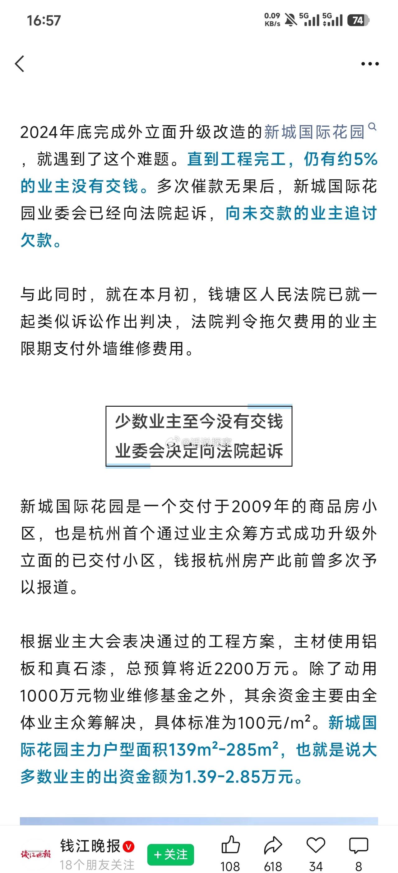 近日,杭州一小区众筹维修外立面事件,引发诸多网友议论纷纷,业委会状告未交款业主,法院判令拖欠费用的业主限期支付外墙维修费用。