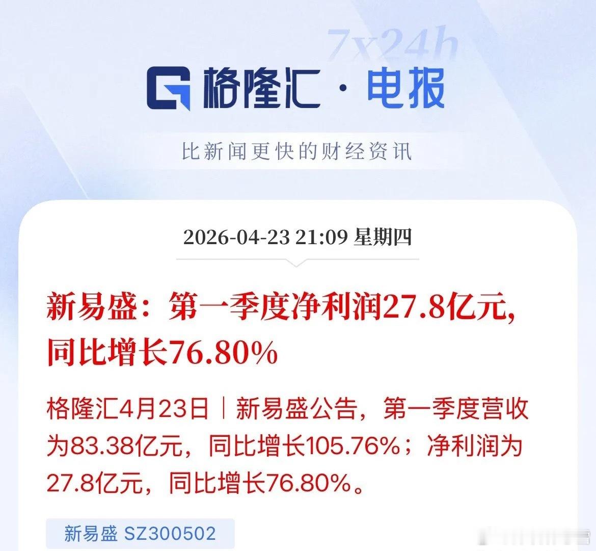 CPO概念总算缓了口气~“易中天”里的新易盛交出炸裂财报:一季度营收83.38亿元,同比暴涨105.76%,净利润27.80亿元,同比增长76.80%,妥妥的业绩硬核支撑!