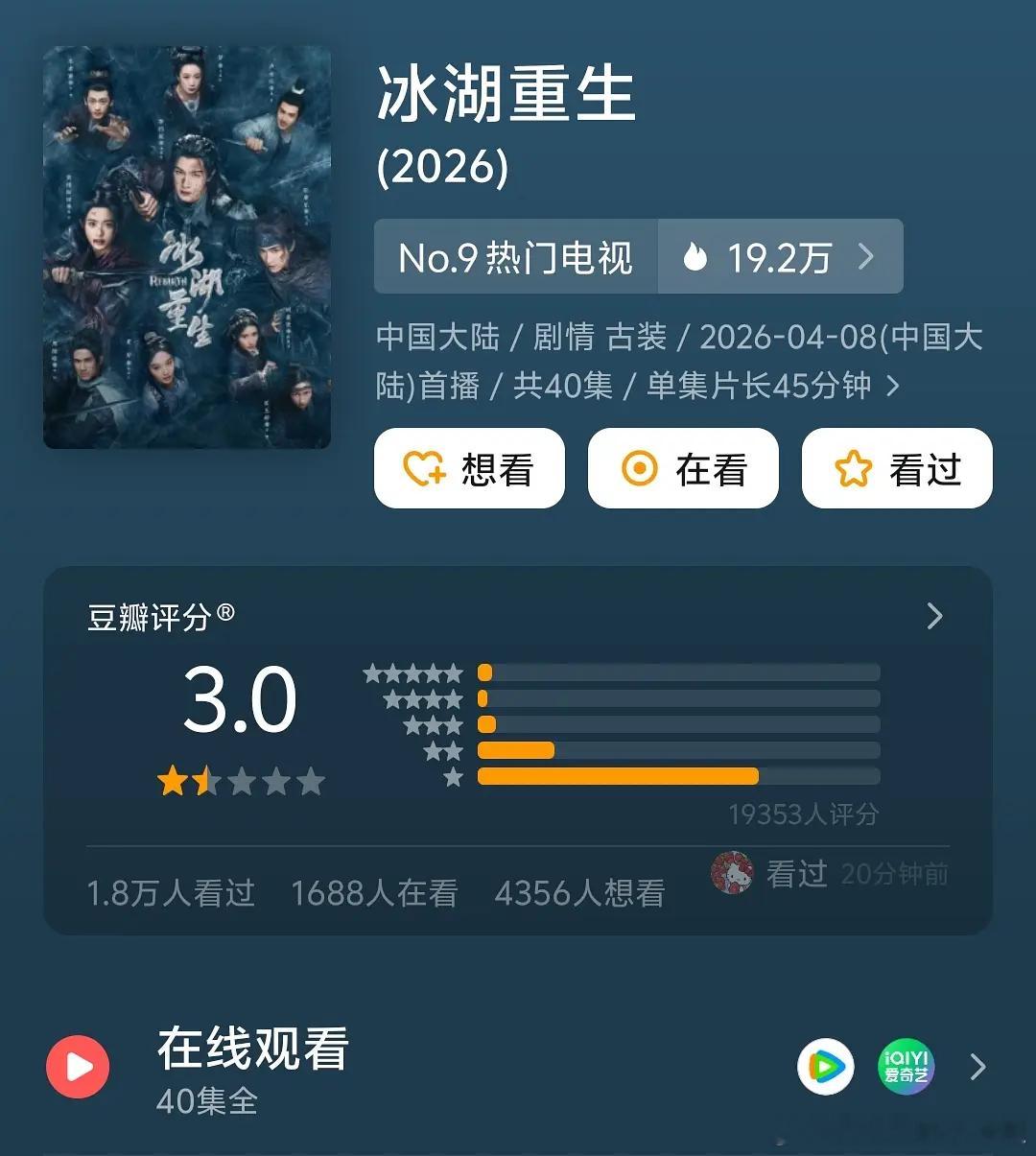 李昀锐的冰糊重生评分竟然从3.2降到3.0了,李昀锐没有一点粉丝吗?