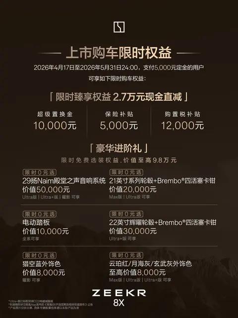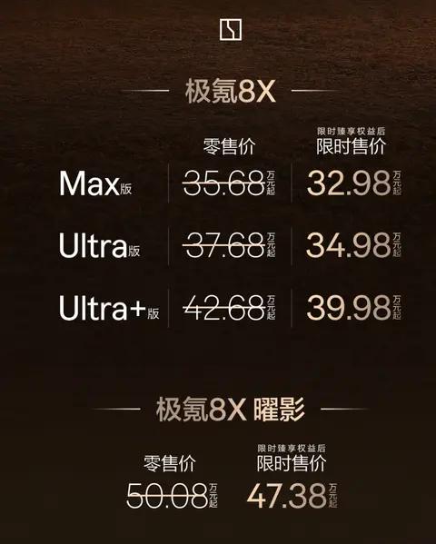 极氪8X正式上市,官方价35.68万起,限时到手 32.98 万起,属于品牌首款走量的插混SUV。 能看出来极氪这次定价很有诚意,一上来就放出不小的限时让利,明显是想深耕高端家用混动市场,打破原本固有的市场格局。 这个价位段本身竞争就很激烈,极氪靠着定价优势入场,给同级别消费者多了一个靠谱的新选择,也能带动整个细分市场保持良性竞争。品牌本身的口碑底蕴还在,这次拓宽动力路线,也是完善自身产品布局,不再局限于纯电赛道。 唯一比较浅的小问题就是限时优惠有时间周期,后续价格回调之后,购车性价比会有所变化,普通消费者如果不急着用车,可以稍微观望节奏。整体来看这波上市规划很稳妥,没有盲目内卷,更多是踏踏实实补齐市场需求。【来自懂车帝车友圈】
