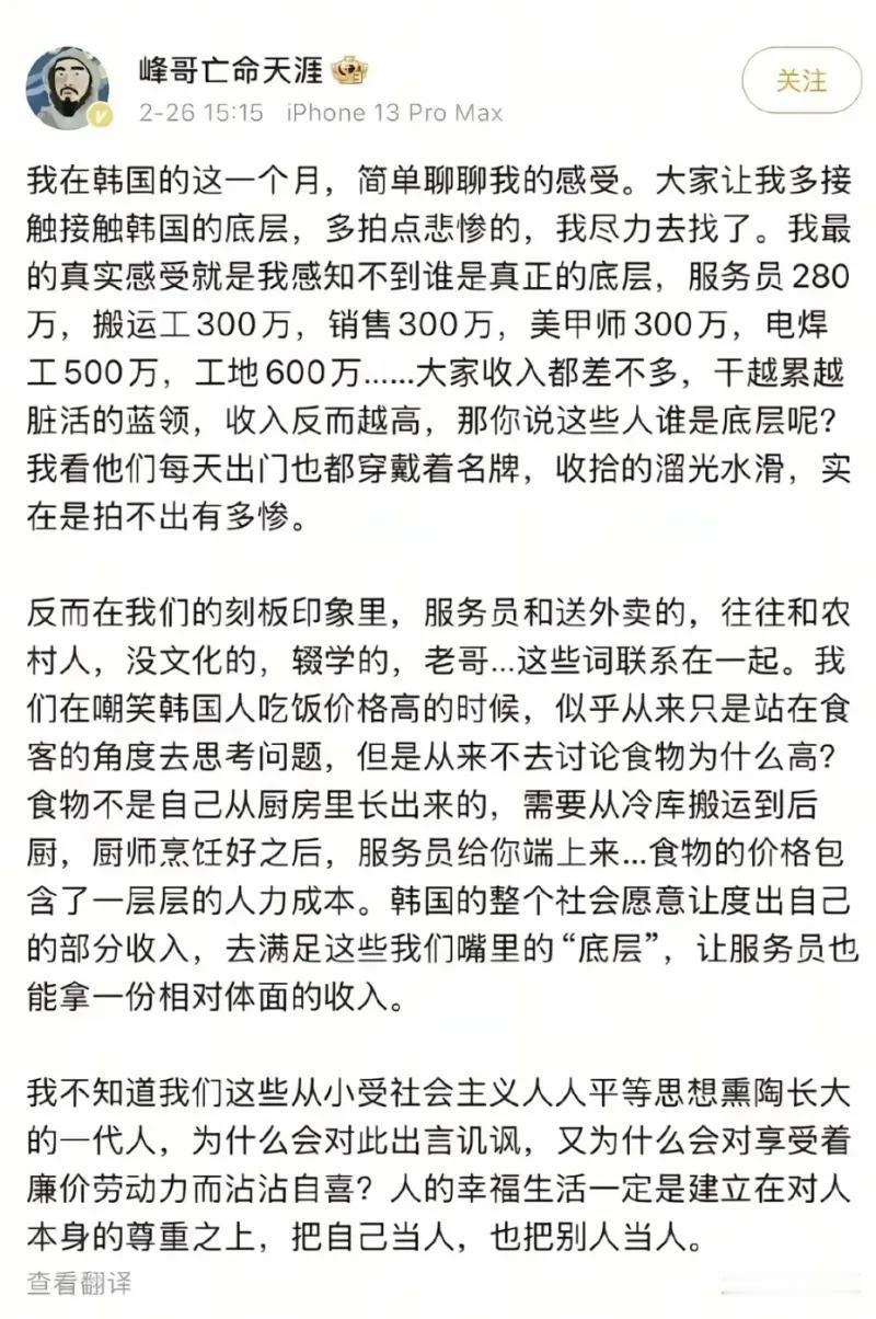 这篇帖子是博主在韩国旅居一个月后的感悟与观点输出:作者在韩国走访当地服务业、体力劳动者后发现,韩国服务员、搬运工、电焊工、工地工人等蓝领岗位收入不低,且越是脏累辛苦的体力工作薪资反而越高,从业者大多穿戴体面,很难拍出大众印象里底层凄惨的样子;反观国内,大众长期把服务员、外卖员等体力服务业从业者和弱势群体、底层人群绑定,一边嘲笑韩国餐饮物价高昂,一边享受国内廉价劳动力带来的低价便利,却很少思考餐饮高价本质是全社会为体力劳动者的人力成本买单,韩国通过抬高服务人力成本,让底层劳动者能获得相对体面的收入;作者对此发出反思,我们从小接受人人平等的教育,却嘲讽韩国劳动者的体面收入、还对国内廉价劳动力环境沾沾自喜,而真正幸福有尊严的生活,本质是尊重每一个劳动者,既把自己当人,也把别人当人。 但这篇内容也存在明显片面性:文中薪资均为税前毛收入,未扣除高额税费社保;完全隐瞒韩国超高物价、超长劳动工时、高危重体力的工作代价,也忽略了韩国蜷缩在郊区、不被游客看见的隐形底层人群,只截取韩国光鲜的游客视角美化现状,刻意放大落差进行情绪输出,两种社会模式各有代价,并非文中单方面描述的完美优越。