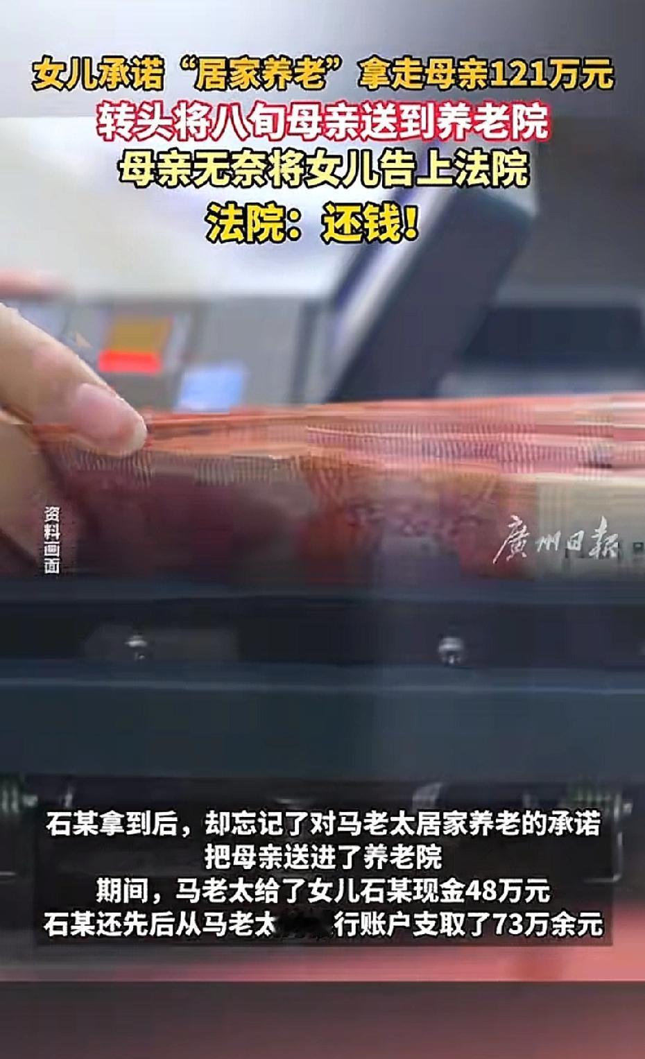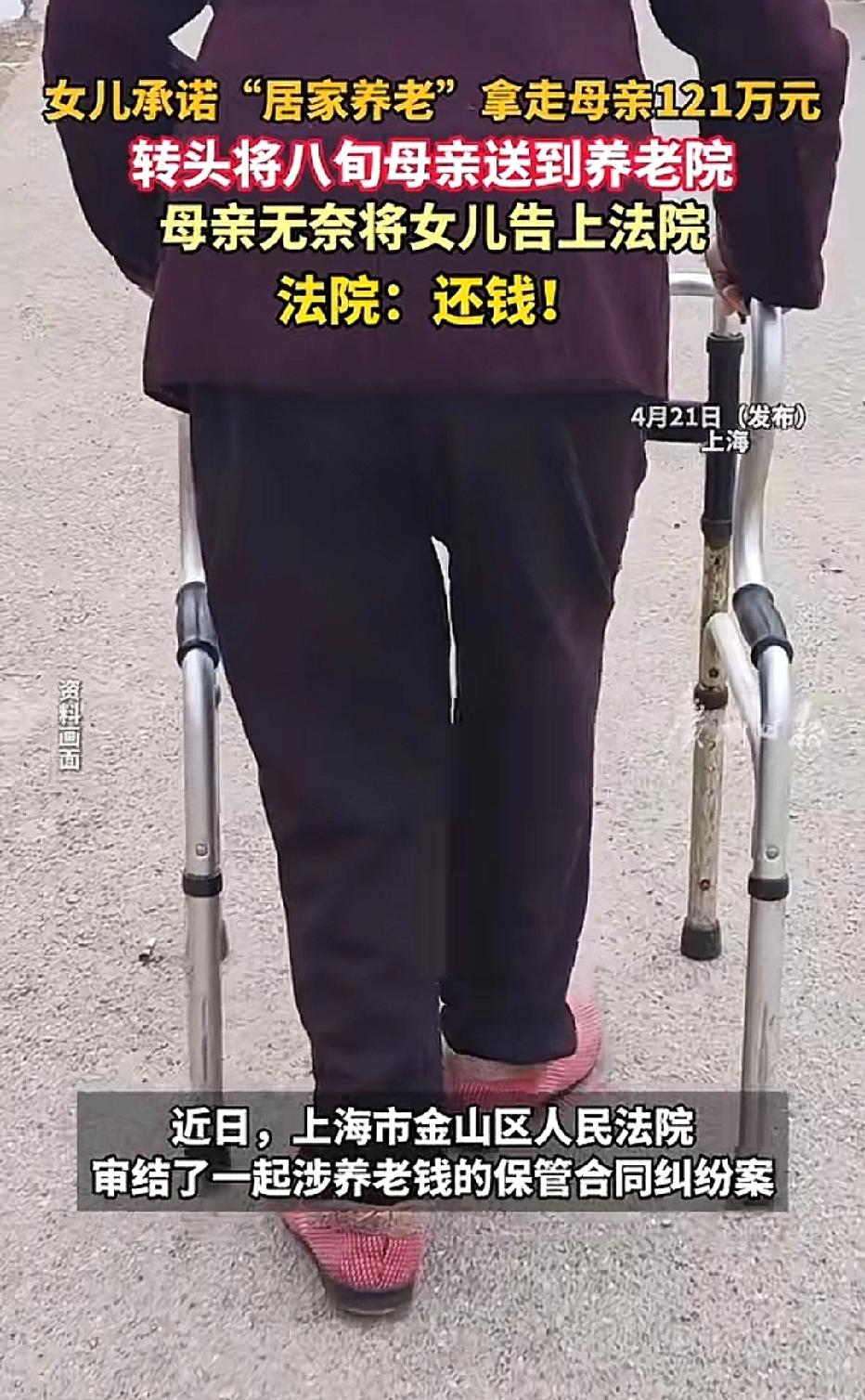 上海,女子承诺给88岁母亲养老,老人将存有121万银行卡交给女儿保管,没想到,女儿拿到银行卡后,却将母亲送到养老院。母亲提出返还财产,女儿只返还了90万,却不承认和拒绝返还剩下的30万,母亲一气之下,将女儿告上法庭。法院这样判! 据悉,88岁的马老太,一生省吃俭用,攒下121万元养老积蓄。 这笔钱是她安享晚年、老有所依的全部底气。 随着年纪渐长,马老太身体日渐衰弱,生活自理能力越来越差,身边时刻需要人照料,晚年养老成了她最忧心的事。 马老太育有一女石某,为了让自己晚年能得到悉心照料,安度余生,马老太多次与女儿石某沟通养老事宜。 石某当着家人和亲友的面,郑重承诺会亲自照顾母亲晚年生活,承担起全部养老责任,让马老太无需担忧后续生活。 马老太听着女儿恳切的承诺,念及血脉亲情,她彻底放下心防,选择毫无保留地信任女儿。 马老太将自己名下多张银行存折、存有大额资金的银行卡,以及48万元现金一并交给石某保管,全部财产折合共计121万元,悉数交由女儿代为管理。 马老太满心以为,自己交出全部积蓄,换来的是女儿贴身照料、居家养老的安稳晚年。 却不曾想,这一决定竟让自己陷入财产被侵占、老无所养的困境。 石某拿到母亲的财产后,全然违背当初的养老承诺。 她不仅没有将马老太接到身边悉心照料,反而以各种借口推脱赡养责任,最终擅自将马老太送至当地养老院。 马老太得知自己被女儿送至养老院、居家养老的希望彻底破灭后。 她伤心又愤怒,对女儿的失信行为倍感心寒,当即提出要求石某返还全部121万元养老财产。 面对母亲的合理诉求,石某百般推诿,仅向马老太返还了90万元。 石某对于剩余31万元款项,矢口否认侵占事实,以各种无理借口拒绝返还,甚至对马老太的催促置之不理,态度十分强硬。 经事后核查,除了马老太亲手交付的48万元现金外,石某还在未征得母亲同意的情况下,私自从马老太的银行卡中支取73万余元。 两笔款项相加,恰好是马老太交付的全部积蓄,石某私自侵占、拒不返还的事实清晰明了。 辛辛苦苦一辈子的养老钱被亲生女儿侵占,晚年生活无依无靠。 88岁的马老太在绝望与愤怒中,决定拿起法律武器维护自身合法权益。 她一纸诉状将女儿石某告上法庭,要求石某返还剩余全部侵占款项。 法庭审理过程中,马老太提交了银行流水记录、现金交付凭证、亲友证言等相关证据,清晰还原了自己将121万元财产托付石某保管、石某违背养老承诺并私自支取款项的全部事实。 石某虽极力辩解,试图否认侵占行为,却无法提供任何证据证明案涉款项属于赠与,也无法说明剩余款项的合理用途。 《民法典》第247条规定:所有权人对自己的不动产或者动产,依法享有占有、使用、收益和处分的权利。 马老太作为案涉121万元款项的所有权人,对该笔财产拥有完全支配权,未经其明确同意,任何人不得擅自处分、侵占。 《民法典》第888条规定:保管合同是保管人保管寄存人交付的保管物,并返还该物的合同。 石某作为保管人,负有妥善保管款项、按期全额返还的法定义务,其拒不返还剩余款项的行为,已构成违约。 《老年人权益保障法》第22条规定:老年人对个人的财产,依法享有占有、使用、收益和处分的权利,子女或者其他亲属不得干涉,不得以窃取、骗取、强行索取等方式侵犯老年人的财产权益。 石某作为子女,违背养老承诺、侵占母亲养老积蓄,既违反法律规定,也违背公序良俗。 最终,法院依法判决石某于判决生效之日起十日内,向马老太返还剩余侵占的31万元款项,并支付相应资金占用利息,全额归还马老太的养老积蓄,切实维护了老年人的合法财产权益。 亲情不该成为谋取私利的工具,赡养老人是子女的法定义务,老年人的财产权益受法律严格保护。 子女即便代为保管父母财产,也无权擅自侵占、处分,任何违背孝道、触碰法律底线的行为,都将受到法律的严惩。