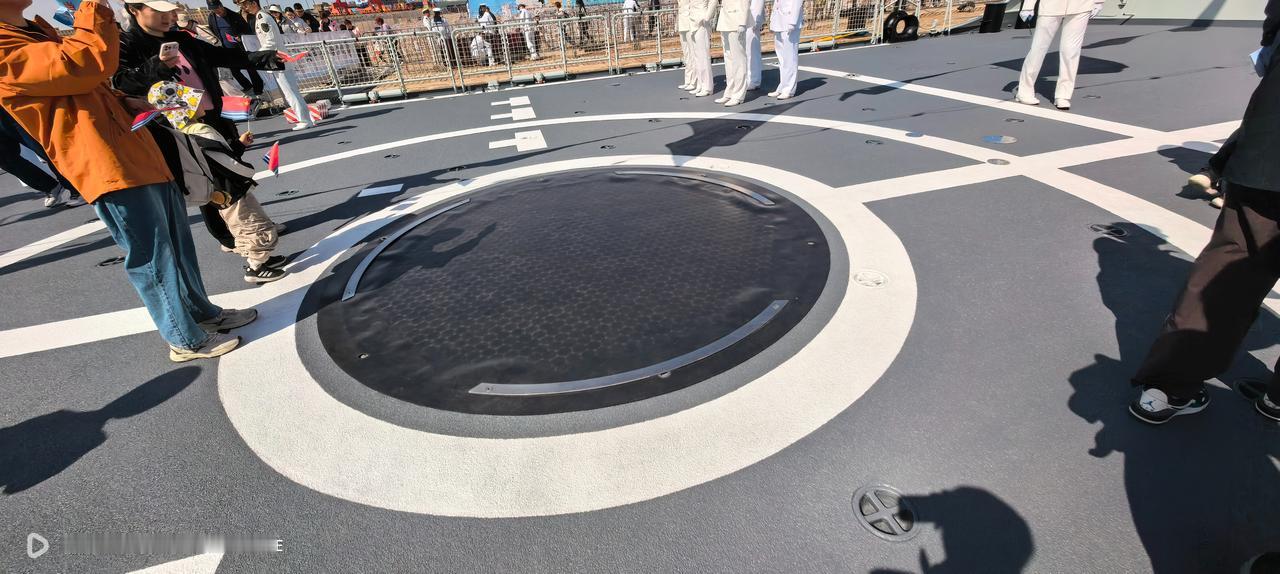 121“齐齐哈尔”号导弹驱逐舰飞行甲板,鱼叉直升机助降系统,甲板表面有专用防滑粗颗粒防滑涂层,大幅增加摩擦力,防止舰载机、舰面人员在风雨结露环境打滑。机库上方有甲板泛光作业照明灯,用于夜间甲板全域照明以及直升机辅助起降照明(不是引导系统)。 还有个小细节图3飞行甲板机库前方有个小长方形水密检修舱盖。121舰是老批次短甲板的052D,很多配置都没有,比如甲板助降移动导轨、鱼雷升降机这些