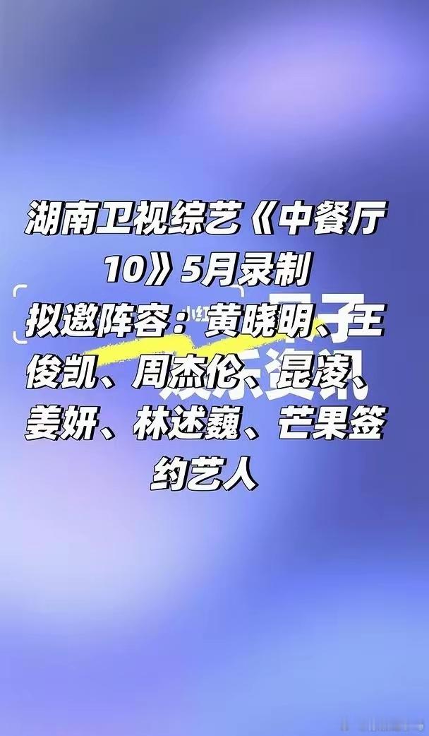 《中餐厅10》新瓜湖南卫视老牌综艺《中餐厅》迎来十周年特辑,网传5月启动海外录制,地点暂定泰国、新西兰等地。网传豪华拟邀阵容曝光:黄晓明、王俊凯、周杰伦、昆凌、姜妍、林述巍,再加芒果自制艺人助阵。顶配名单一出瞬间刷屏,最大看点当属周杰伦&王俊凯梦幻同框,偶像与好友齐聚,氛围感拉满。黄晓明作为元老店长大概率回归,林述巍坐镇后厨稳住厨艺,姜妍擅长居家料理,搭配周氏夫妇加盟,话题与收视直接拉满。不过目前全员仅为拟邀阶段,周杰伦档期、身体原因加盟概率偏低,大概率是招商引流套路,最终阵容以官方官宣为准。