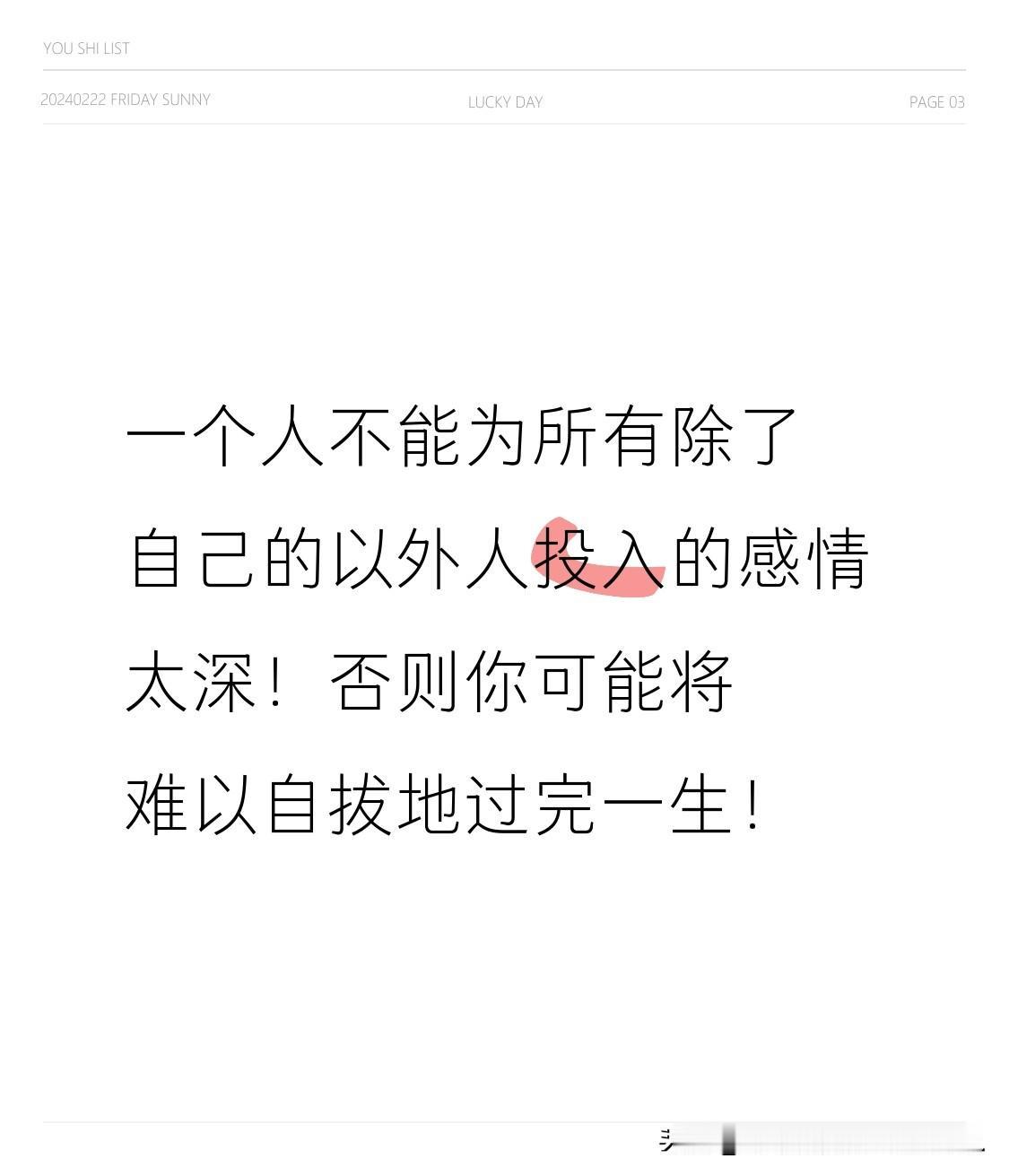 一个人不能为所有除了自己的以外的人投入的感情太深!否则你可能将难以自拔地过完一生