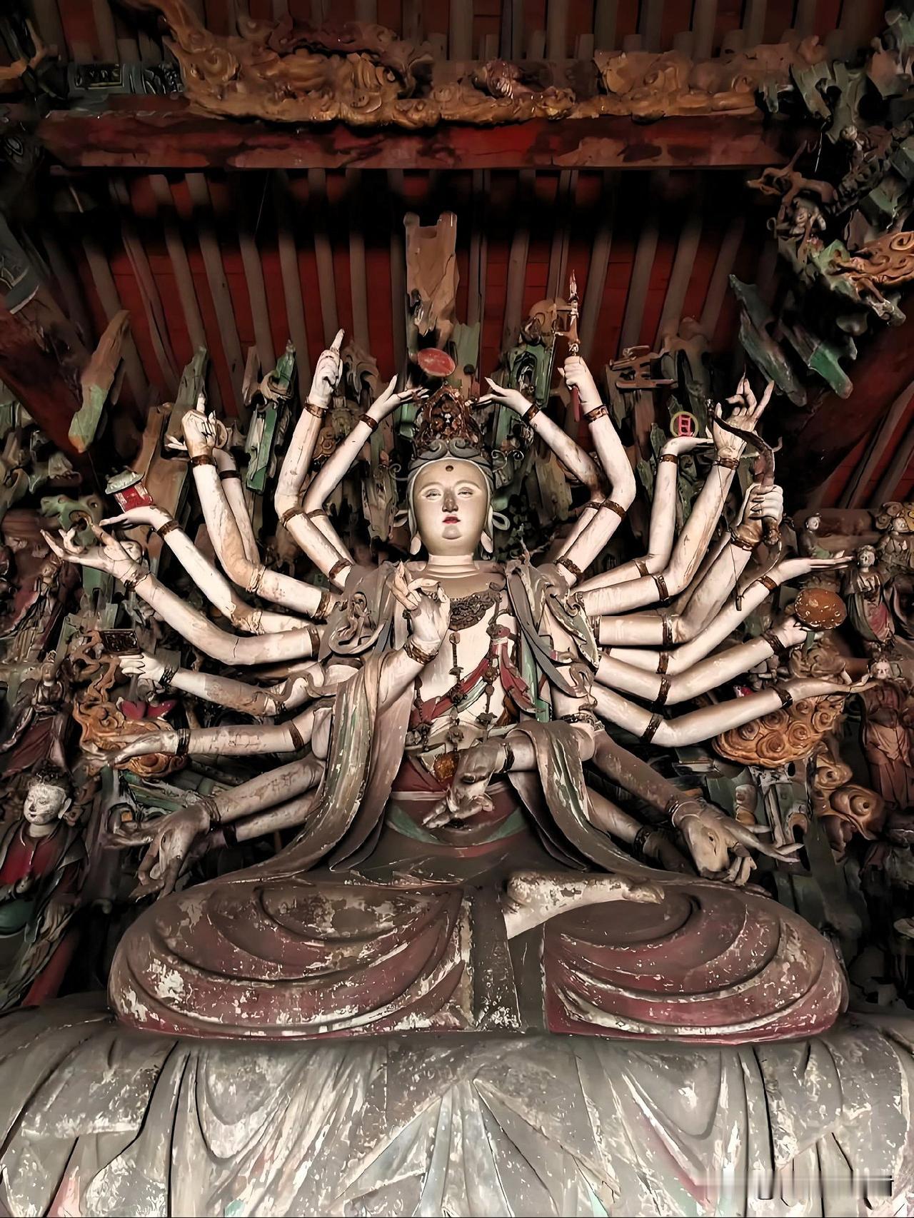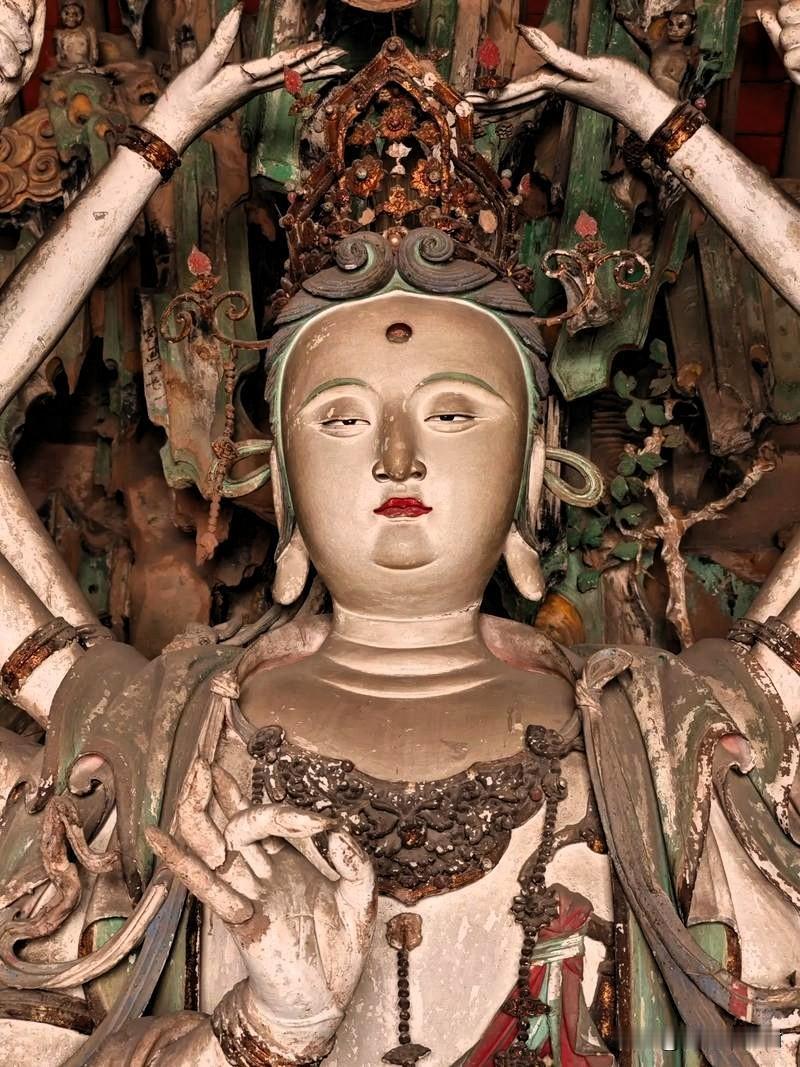 平遥双林寺的千手观音,看完才懂什么叫东方彩塑天花板 进双林寺菩萨殿第一眼,就被这尊明代千手观音钉住了脚步。 没有鎏金的炫目,却用素胎和矿物彩,塑出了600年前最动人的慈悲。26只手臂如孔雀开屏般舒展,每只手都握着不同法器,掌心那只眼睛,像是真的在看着世间所有求而不得的人。 最绝的是她的脸。历经几百年的风烟,依然温润如玉,垂眸的瞬间,连殿里的灰尘都慢了下来。 旁边的悬塑群像跟着她一起“前倾”,好像真的在俯身护着底下的众生。 比起热闹的网红打卡点,这里的震撼是静悄悄的。站在她面前,不用说话,心里的褶皱好像都被抚平了。 来平遥别只逛古城,来这里看看吧,一眼就是600年的温柔。 山西双林寺 平遥旅行 明代彩塑 千手观音