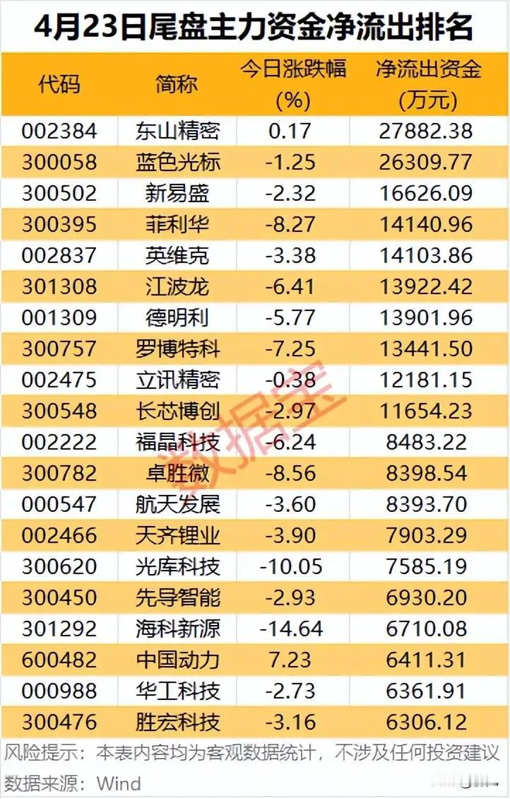 最高净流出2.79亿!4月23日尾盘主力资金出逃20只个股全解析 本次梳理为昨日尾盘主力资金净流出排名前20的个股,合计尾盘净流出规模超27亿元。东山精密以近2.79亿元的净流出额位居榜首,蓝色光标以超2.63亿元的净流出额紧随其后,二者形成明显的第一梯队。板块分布上,电子元器件、消费电子、半导体、光通信、新能源赛道成为资金出逃的重灾区,超九成标的当日录得下跌,海科新源单日大跌14.64%、光库科技跌停,仅2只标的当日收涨,资金获利了结与避险抛售情绪浓厚。 个股梳理分析 1. 东山精密:尾盘主力资金净流出2.79亿元,位列榜单首位,当日微涨0.17%,公司是全球消费电子精密制造龙头,核心客户覆盖全球头部科技厂商,尾盘遭主力集中抛售。 2. 蓝色光标:尾盘主力资金净流出2.63亿元,当日收跌1.25%,公司是国内营销传播龙头,AI营销业务持续布局,尾盘遭主力资金大幅出逃,资金兑现意愿较强。 3. 新易盛:尾盘主力资金净流出1.66亿元,当日收跌2.32%,公司是全球光模块核心厂商,高速率产品行业领先,AI光模块需求预期降温,遭主力资金减持。 4. 菲利华:尾盘主力资金净流出1.41亿元,当日大跌8.27%,公司是国内石英材料龙头,产品覆盖半导体、航空航天领域,当日股价大幅回调,尾盘资金加速出逃。 5. 英维克:尾盘主力资金净流出1.41亿元,当日收跌3.38%,公司是国内温控设备龙头,深度绑定算力与新能源客户,行业竞争加剧预期下,遭主力资金减持。 6. 江波龙:尾盘主力资金净流出1.39亿元,当日大跌6.41%,公司是国内存储模组龙头,车规级存储产品持续突破,消费电子需求复苏不及预期,遭资金抛售。 7. 德明利:尾盘主力资金净流出1.39亿元,当日大跌5.77%,公司是国内存储控制芯片核心厂商,产品覆盖消费与工业领域,行业周期波动下,遭主力资金减持。 8. 罗博特科:尾盘主力资金净流出1.34亿元,当日大跌7.25%,公司是光伏电池片设备核心厂商,TOPCon设备市占率领先,光伏扩产放缓预期下,遭资金出逃。 9. 立讯精密:尾盘主力资金净流出1.22亿元,当日微跌0.38%,公司是全球消费电子代工龙头,深度绑定苹果产业链,消费电子需求疲软,尾盘遭主力资金减持。 10. 长芯博创:尾盘主力资金净流出1.17亿元,当日收跌2.97%,公司是国内光通信器件核心厂商,产品覆盖数据中心与电信市场,行业景气度回落,遭资金抛售。 11. 福晶科技:尾盘主力资金净流出8483.22万元,当日大跌6.24%,公司是国内激光光学元器件龙头,产品覆盖激光与光通信领域,行业需求不及预期,遭资金减持。 12. 卓胜微:尾盘主力资金净流出8398.54万元,当日大跌8.56%,公司是国内射频芯片龙头,深度绑定安卓手机厂商,消费电子复苏乏力,尾盘遭主力资金出逃。 13. 航天发展:尾盘主力资金净流出8393.70万元,当日收跌3.60%,公司是军工电子信息化核心标的,业务覆盖电磁安防、通信领域,业绩承压下遭主力资金减持。 14. 天齐锂业:尾盘主力资金净流出7903.29万元,当日收跌3.90%,公司是全球锂矿龙头,锂价持续波动下业绩承压,新能源赛道情绪回落,遭尾盘资金抛售。 15. 光库科技:尾盘主力资金净流出7585.19万元,当日跌停收跌10.05%,公司是国内光器件核心厂商,800G光模块产品持续布局,当日股价跌停,资金加速出逃。 16. 先导智能:尾盘主力资金净流出6930.20万元,当日收跌2.93%,公司是全球锂电设备龙头,深度绑定头部动力电池厂商,锂电扩产放缓,遭主力资金减持。 17. 海科新源:尾盘主力资金净流出6710.08万元,当日大跌14.64%,为榜单内跌幅最大标的,公司是锂电池电解液材料厂商,业绩不及预期,遭资金大幅抛售。 18. 中国动力:尾盘主力资金净流出6411.31万元,当日收涨7.23%,为榜单内少数收涨标的,公司是国内船舶动力龙头,军工船舶景气度回升,尾盘遭资金获利了结。 19. 华工科技:尾盘主力资金净流出6361.91万元,当日收跌2.73%,公司是国内激光装备与光通信龙头,AI相关业务布局广泛,板块情绪回落遭资金减持。 20. 胜宏科技:尾盘主力资金净流出6306.12万元,当日收跌3.16%,公司是国内PCB龙头,AI算力PCB产品持续放量,行业竞争加剧下,遭尾盘资金抛售。 总结 4月23日尾盘主力资金出逃的标的高度集中在电子、半导体、新能源等前期热门赛道,反映出市场对相关赛道短期景气度、需求复苏节奏的担忧情绪升温。同时,部分当日大涨的标的也遭资金净流出,体现出短线资金获利了结意愿强烈,市场情绪偏向谨慎,资金更倾向于落袋为安,规避短期波动风险。 本文涉及资讯内容来自网络,仅供参考不构成投资建议!