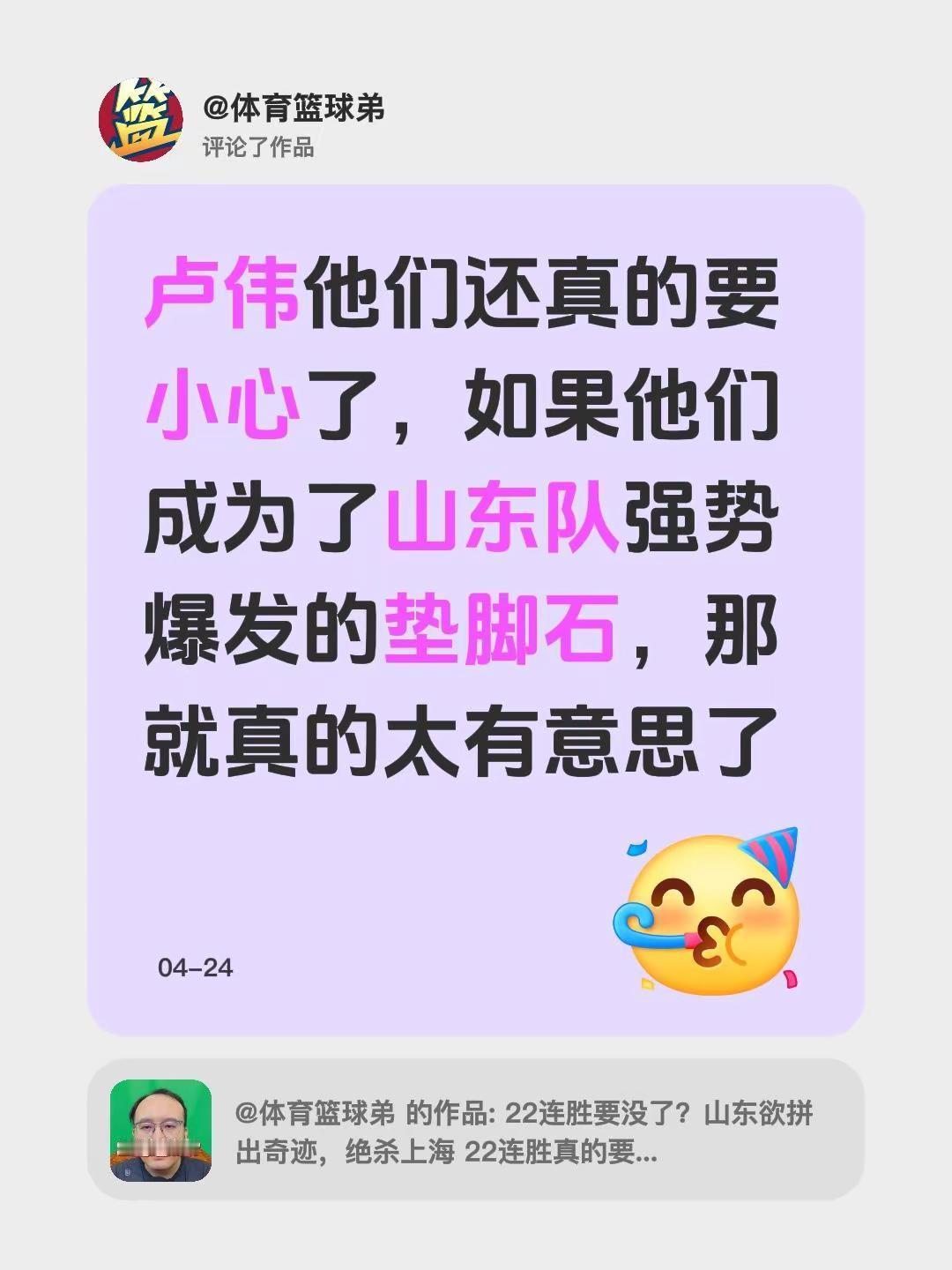 我评论了@体育篮球弟 的作品:卢伟他们还真的要小心了,如果他们成为了山东队强势爆发的垫脚石,那就真的太有意思了
