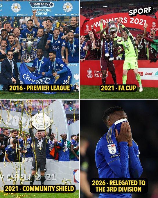 十年前,他们是英超冠军。下赛季,他们将征战英格兰第三级别联赛。👀莱斯特城足球俱
