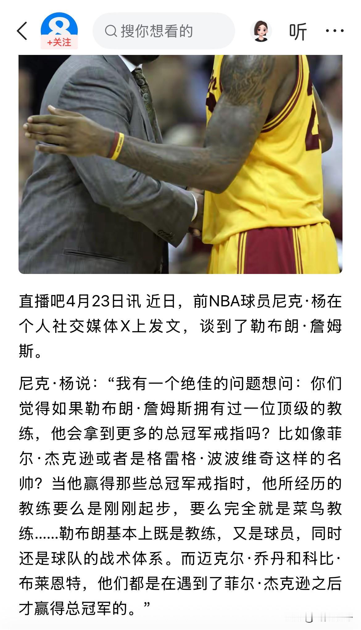 评价乔丹要客观,评价詹姆斯不能吹的过头。 这句话我是送给吹杨跟库班的。 早上刷到下面这样的新闻,我只能摇摇头,他们也配评价乔丹? 先说吹杨,他说詹姆斯职业生涯要是有禅师、波波维奇这样的名帅执教,冠军会拿到更多。 问题是禅师是真不愿意执教詹姆斯啊,禅师认为这样的人不配我来执教,禅师说詹姆斯每两次持球就有一次走步,技术太差了。 再来说一下禅师?没执教乔丹前他只是一个球队助教而已,执教乔丹的时候也是刚刚转正,也就是一个菜鸟教练。他能成为名帅跟乔丹是相互相成的,互相成就对方。 再来说库班,他说乔丹不会去烂队,詹姆斯会去烂队力挽狂澜。哈哈,多好笑。 那么大家来说说詹姆斯去过什么烂队?热火是抱团的超级球队,后来回骑士也是抱团球队,来湖人时第一年没有大腿打不进季后赛,第二年大腿相继而来,到现在来了多少大腿大家数数? 相反乔丹刚加入公牛的时候公牛前一年战绩25胜。詹姆斯刚加入骑士的时候,骑士前一年27胜。问问大家哪支球队更烂?那个时候公牛贩毒泛滥,黑手党肆无忌惮,都没有球星敢去芝加哥打球。 39岁乔丹复出在19胜奇才队,就问詹姆斯有这个胆去这样的球队吗?我想他宁愿退役也不会去这样的烂队,因为他是一个精致的利己主义者。