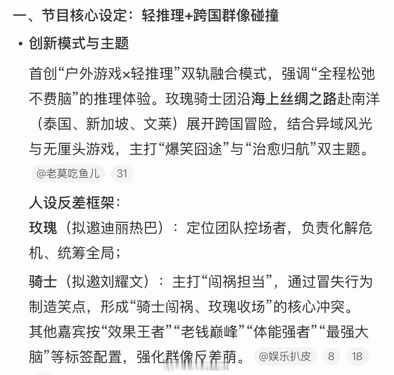 对迪丽热巴来说,开推和玫瑰与骑士,大家觉得哪个综艺更好一点儿?开推最大的问题是糊且无趣,和大侦探比差远了,玫瑰与骑士新综热度会不会高一点儿?