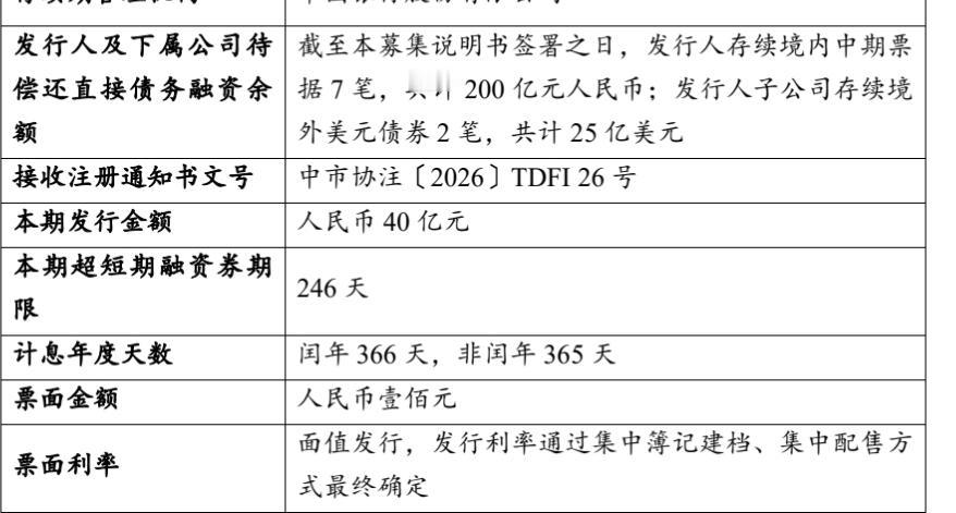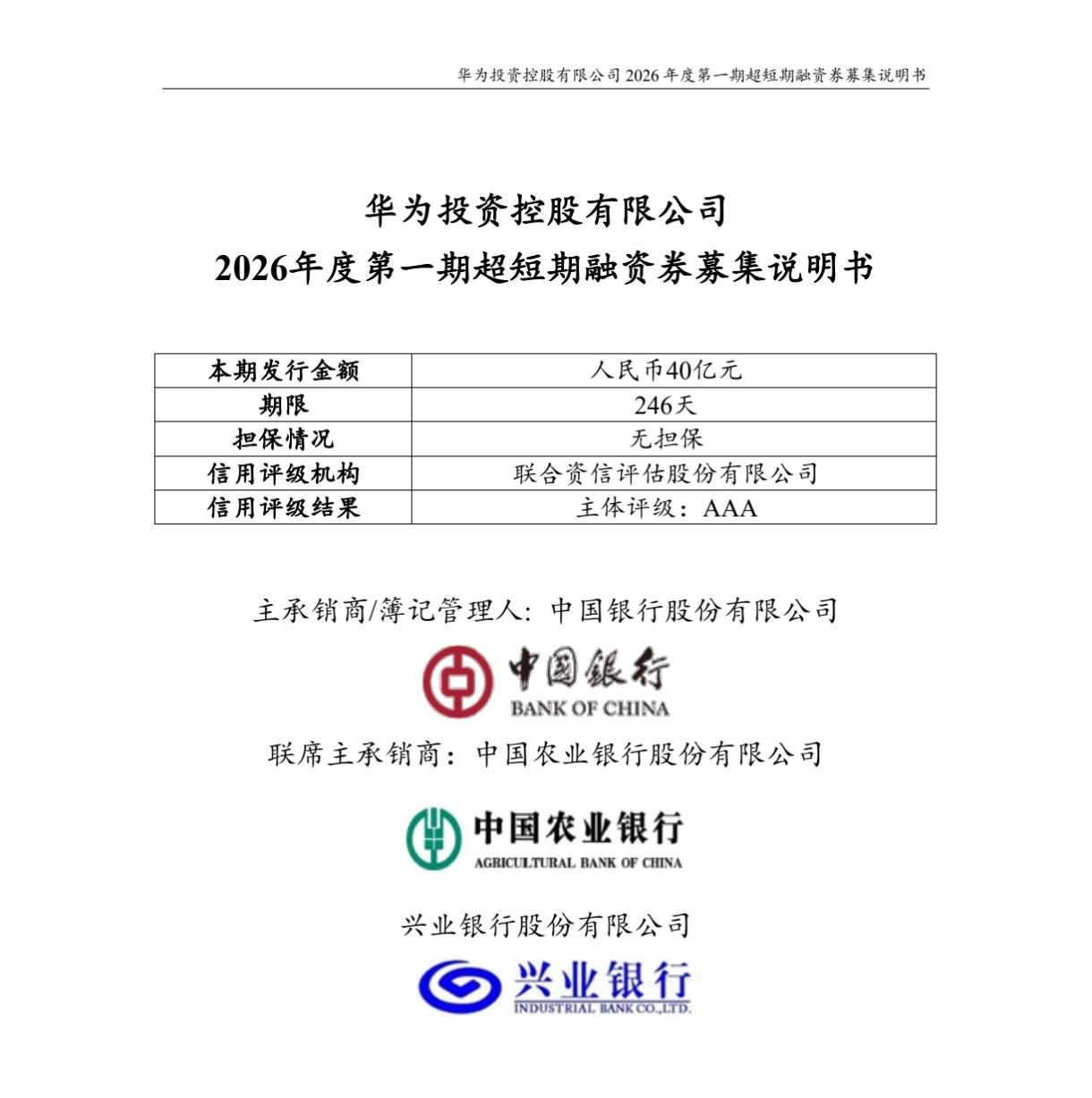 华为投资发行40亿元超短期融资券,期限246天,无抵押无担保。 ●截至4月23日,华为投资存续境内中期票据7笔,合计200亿元;存续境外美元债券2笔,共计25亿美元(大约相当于175亿元)。 ●截至2025年末,华为公司资产总额13349亿元,比2024年底增加448亿元;负债总额7348亿元,比2024年底减少97亿元;其中借款类负债2393亿元,比2024年底减少255亿元;资产负债率55%,下降2.78个百分点。华为的资产负债表越来越漂亮了。 ●宁德时代、比亚迪、吉利控股也都通过发行超短期债券增加流动性。