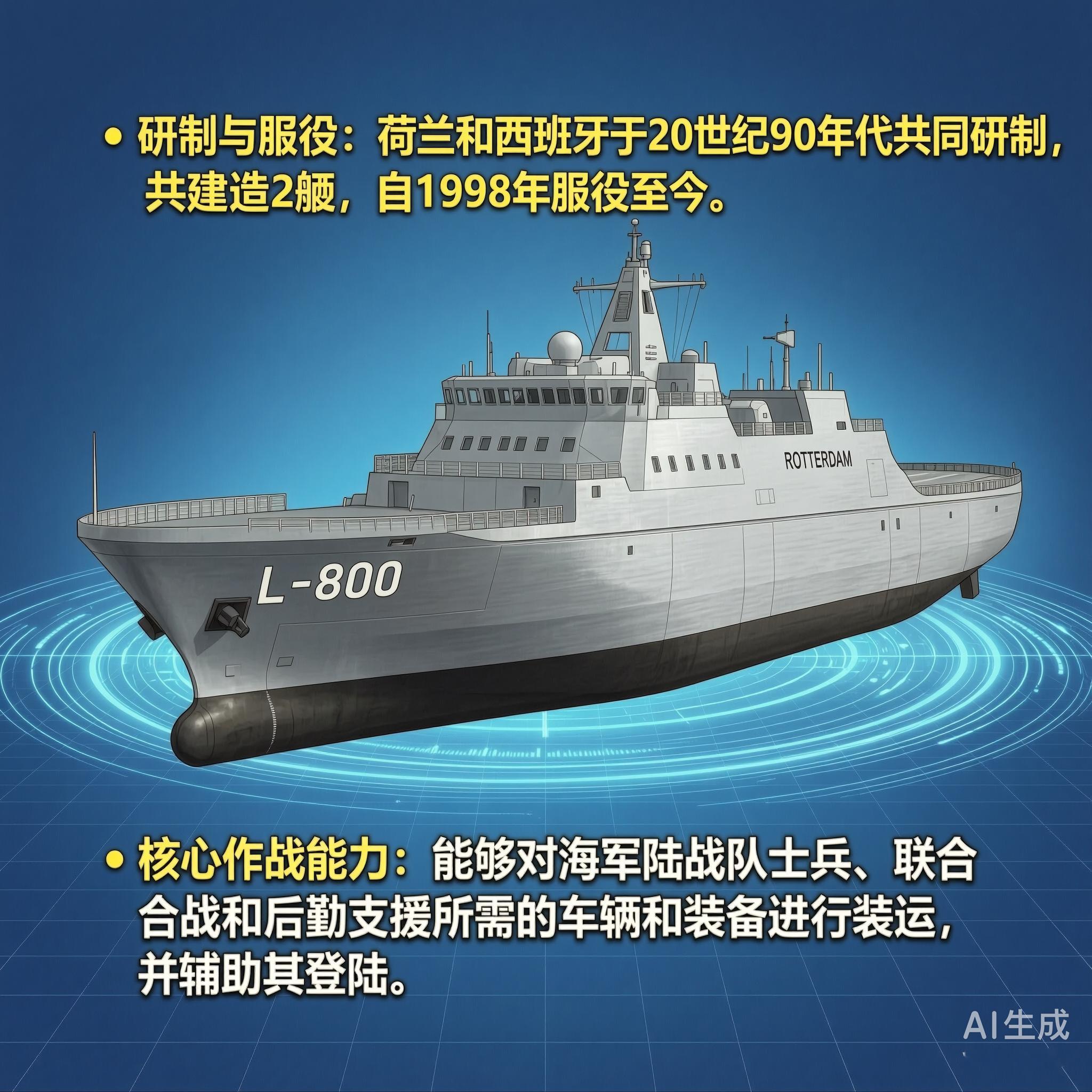 “鹿特丹”(Rotterdam)级船坞登陆舰是荷兰和西班牙于20世纪90年代共同研制的,一共建造了2艘,从1998年服役至今。