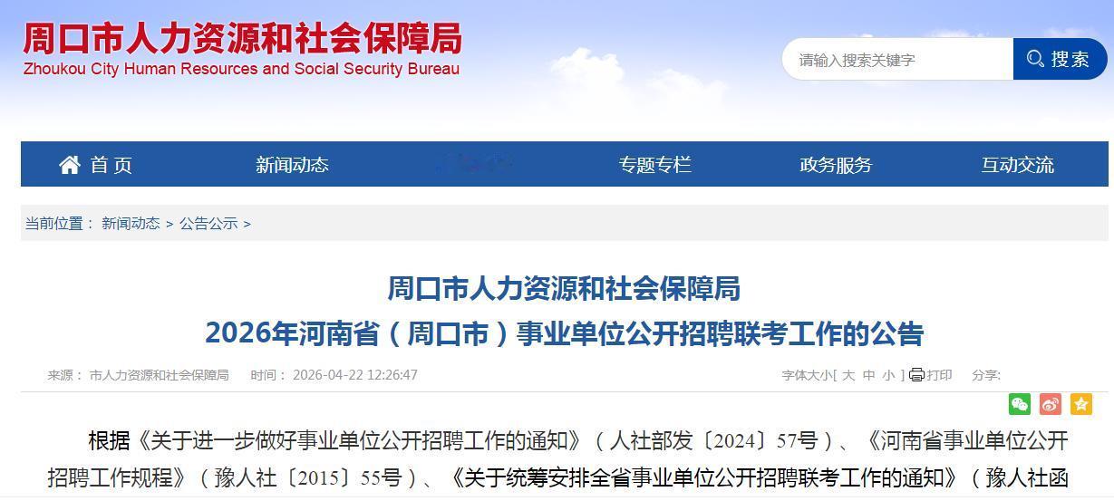 2026年河南省(周口市)事业单位公开招聘487名,报名时间为2026年4月24日9∶00至4月30日17∶00。笔试时间:2026年5月30日上午9∶00-10∶30,《职业能力测验》。2026年5月30日下午14∶00-15∶30,《公共基础知识》或《教育类专业知识》或《卫生类专业知识》。