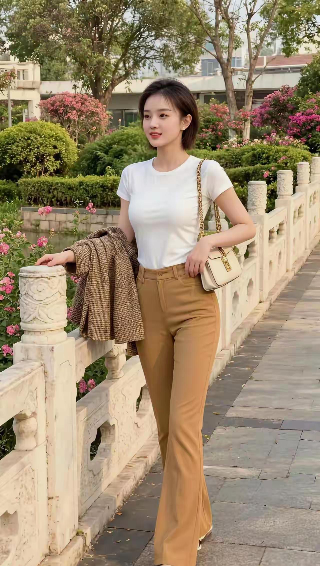 白色上衣+棕色高腰裤,简约优雅,搭配链条包,轻松出街!