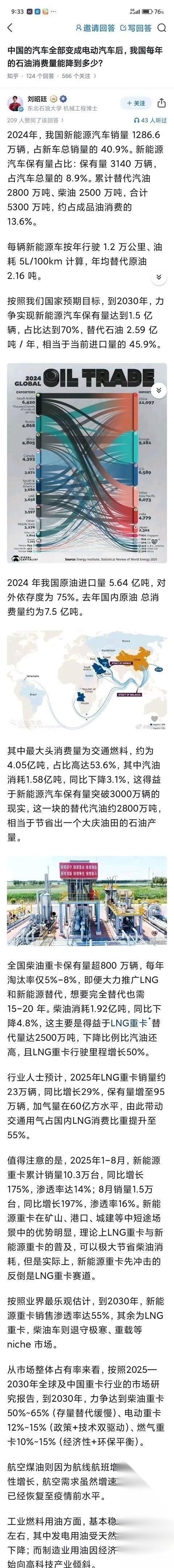 中国的汽车全部变成 电动汽车 后,我国每年的石油消费量能降到多少? 2024年中国石油使用量约7.5亿吨,消费量趋于饱和,不少人琢磨,只要街上全跑绿牌车,咱们以后就不用看人家脸色买油了。 可偏偏怪事来了。现在国内卖出的新车里,快六成都是新能源。按理说该省油了,结果呢?咱们不管是往库里囤原油,还是自家打井抽油的产量,全在往上飙。 车都不怎么喝油了,还费这么大劲攒这黑乎乎的液体干嘛? 这背后,国家算的是一笔大账。 大伙儿对石油的理解容易跑偏,总觉得它就是拿来烧的。往前看二战,日本当年为啥非得去惹美国、偷袭珍珠港?就是因为美国把供油的管子给掐了,它急眼了。放到现在的工业体系里,它哪只是个燃料。平时穿的化纤衣服、用的塑料盆,一路算到天上飞的航天材料,追根溯源,全是这玩意儿变出来的。 咱们国家现在布这么大个局,压根没想“戒油”。 这是要把能源怎么用的主动权,往上提一个档次。 以前汽柴油都拿去让车烧了,堵在路上白白冒黑烟。现在果断把这块低效消耗砍掉。省出来的这海量炼化产能和地方用来干嘛?全砸进高端化工里,去造航空煤油,去搞军民两用的战备储备。 不仅如此,还有后手。 咱们自家省下的这些份额,正好拿去补海外巨大的清洁油品缺口。手里攥着大把富裕的炼化资源,周边那些靠咱们吃饭的买家,还不得乖乖听话。 别觉得电车多了,石油就得进垃圾堆。 当没人再把原油当柴火一样随便烧掉的时候,它才算是真正成了国之重器。往后看,油的地位不但不会掉,只会更硬,身价也会更贵。 对此,你怎么看?